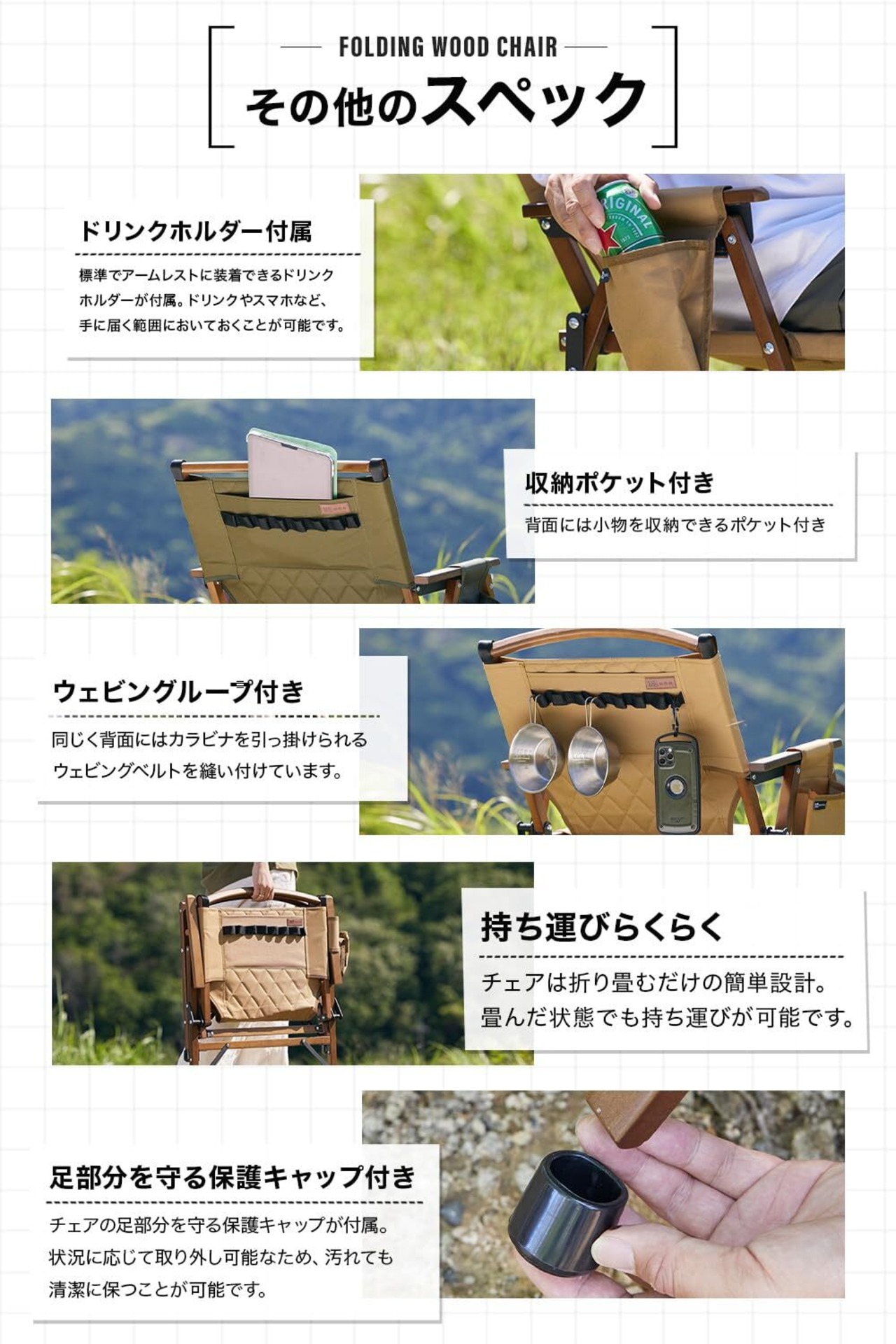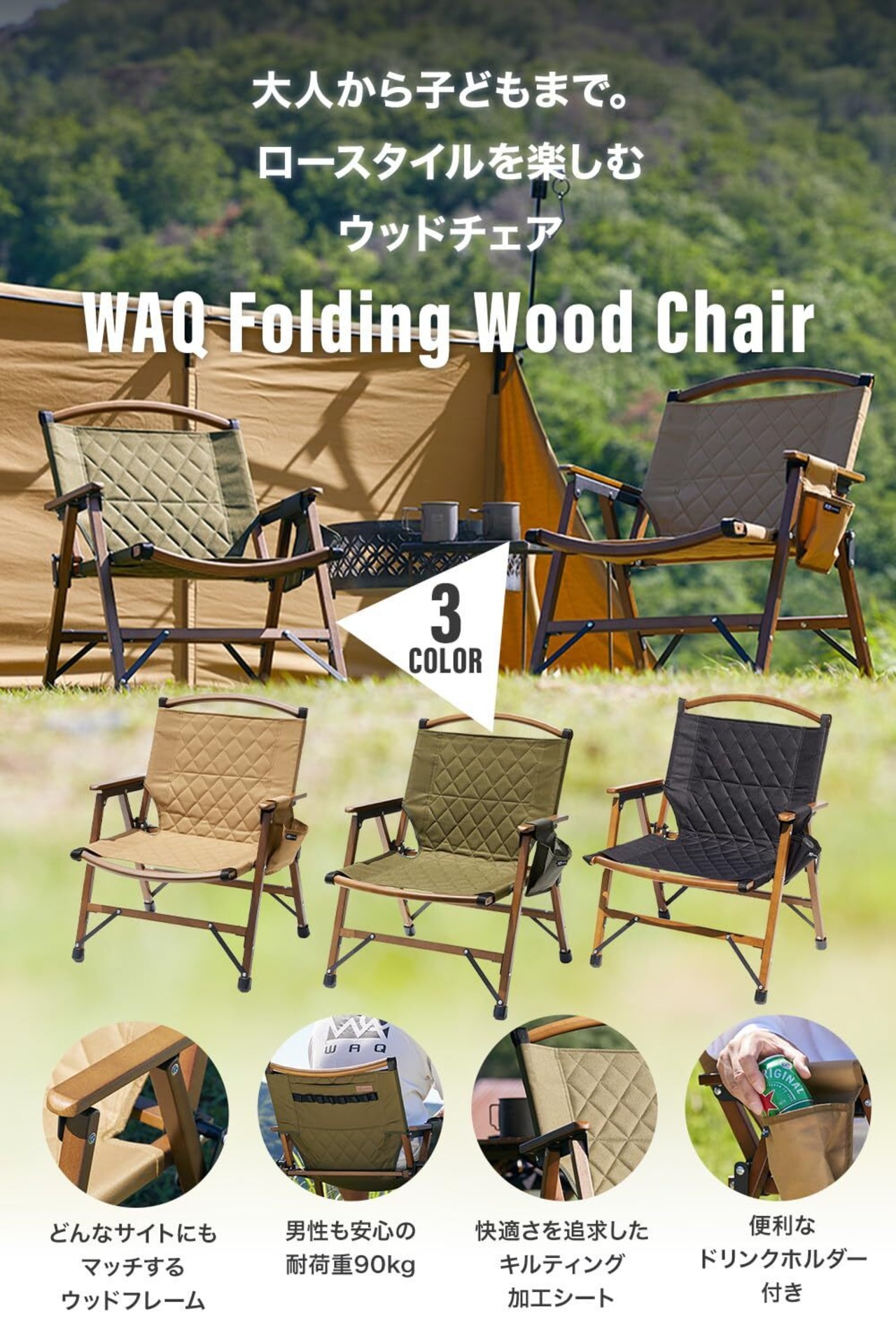 WAQ Folding Wood Chair フォールディングウッドチェア ローチェア 折りたたみチェア ウッドチェア キャンプチェア キャンプ椅子 ドリンクホルダー