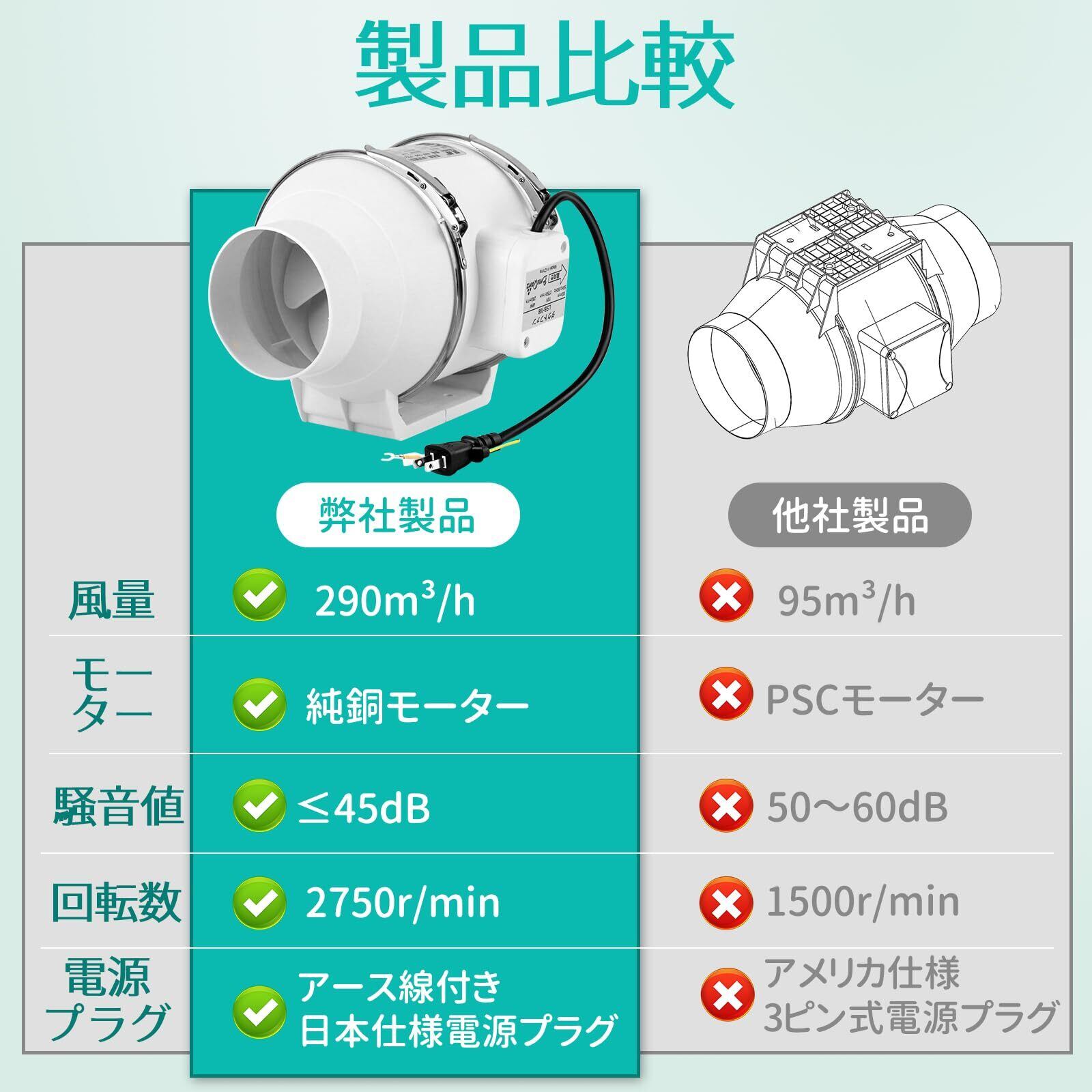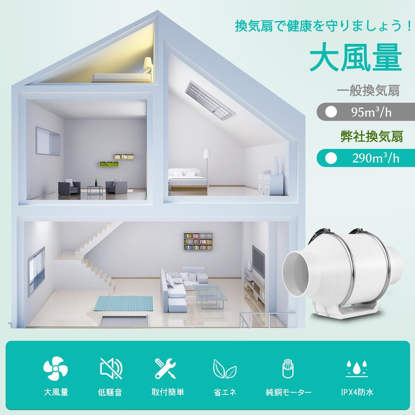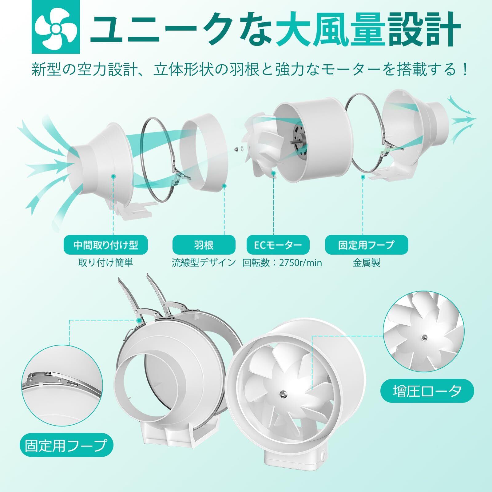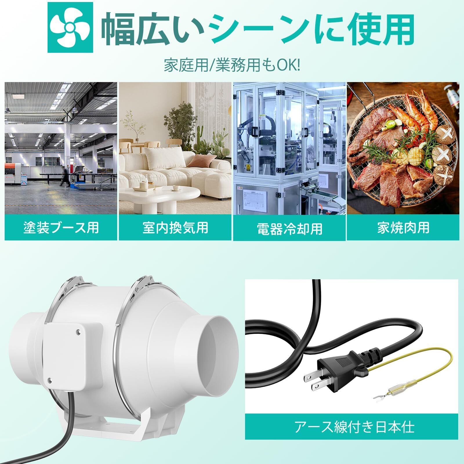 特徴 軽量, 100mm ダクトファン, ダクト用換気扇, 中間取付