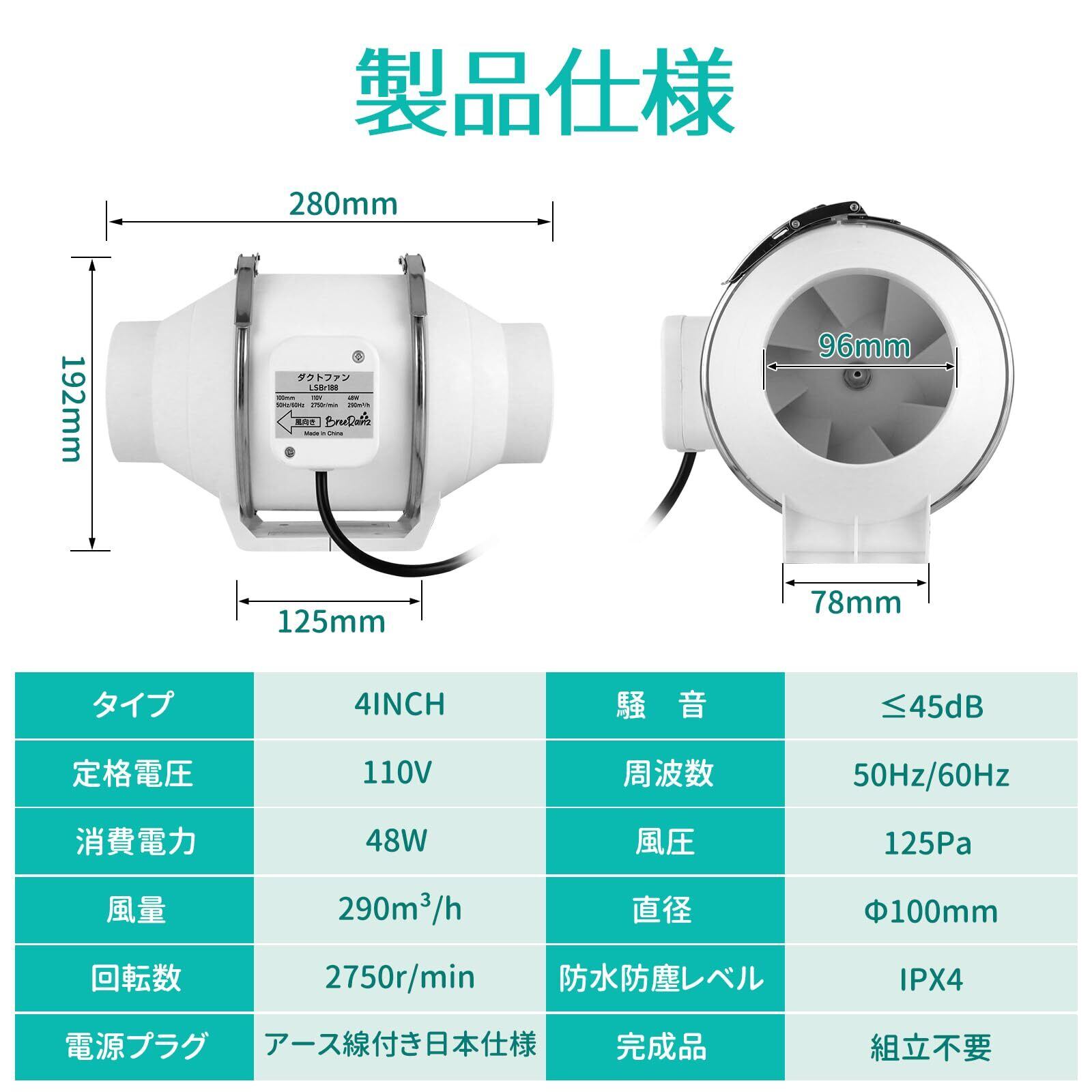 BreeRainz ダクトファン Φ100mm ダクト用換気扇 風量290m³/h 強力 省エネ 静音 排気ファン 中間取付 塗装ブース用 家焼肉 家庭用 業務用 排風機 丸形タイプ 110V 日本仕様電源プラグ (100mm)