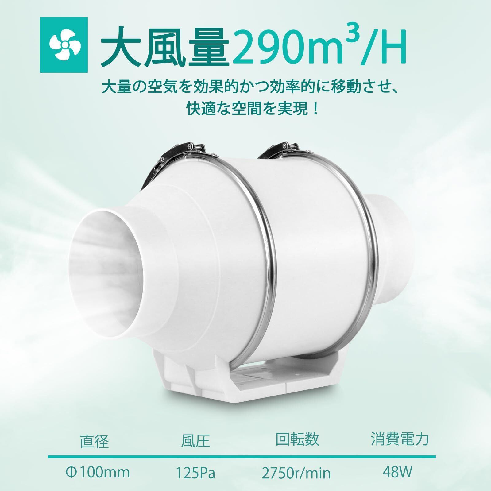 【大風量・家庭用/業務用もOK】弊社のダクトファン(Φ100mm)は新型の空力設計、立体形状の羽根と強力なモーターを搭載して、大量の空気を効果的かつ効率的に移動させ、物体を冷却したり、空間を換気します。送風量は290m³/hに達しので、20畳をわずか18分で排気できます。一人暮らし・電気焼肉器・塗装ブースなどの小スペースでもリビング・オフィス・コンピュータルームのような大スペースでもご利用頂けます。設置場所を選ばない省スペースデザインなので、シーンに合わせて自由に設置できます。