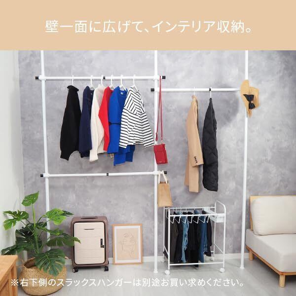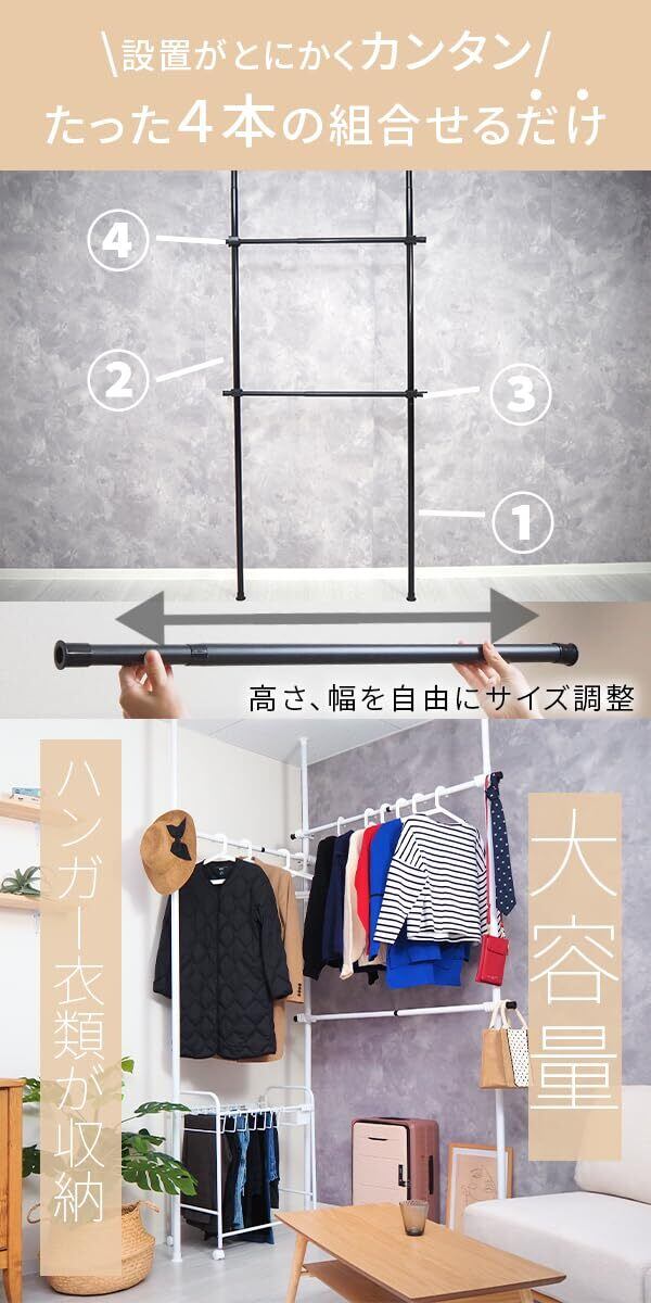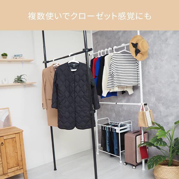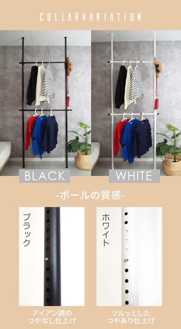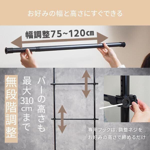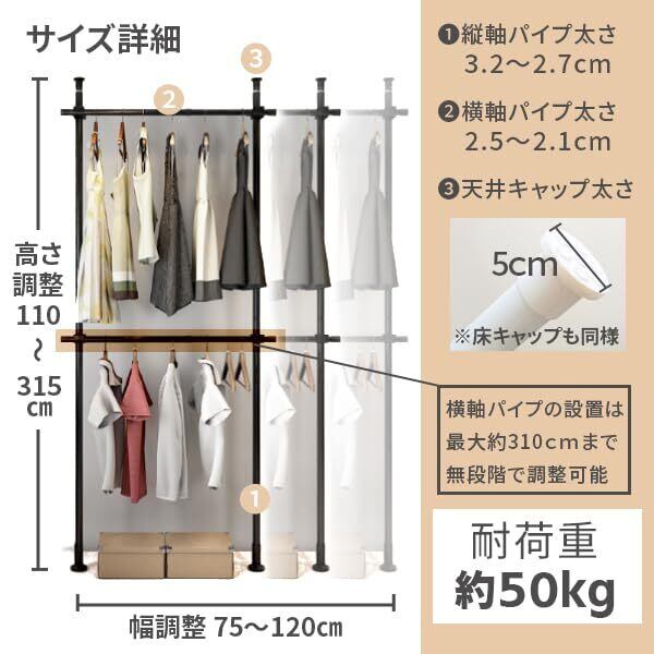 【高さも幅も調節可能】高さは110-310cm、幅は75-120cmで調節することができ、お部屋の広さや天井の高さにあわせて調節できます。また耐荷重は50kgと頑丈なので大容量の洋服収納にも。
