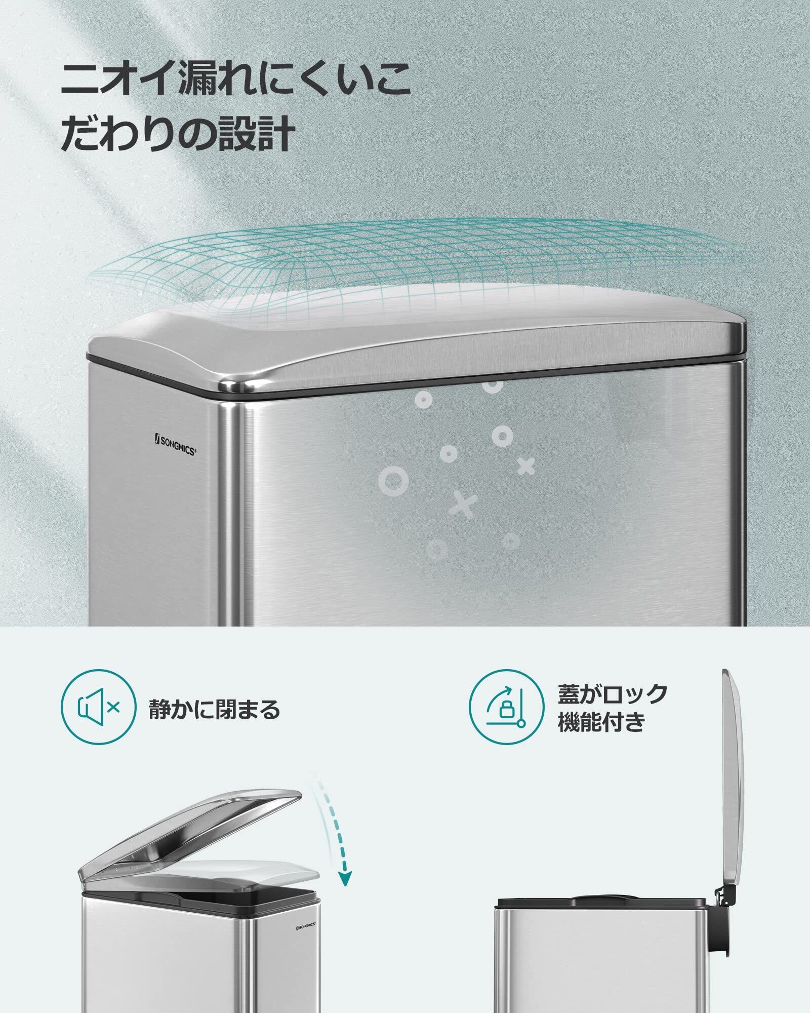 【超静音&長時間開け】フタは静かに閉まるソフトクローズ機能搭載、開閉時の音が静かで、小さなお子様やペットのいる環境でも安心してお使いいただけます。手で蓋を90°持ち上げると、蓋を開いたままにすることができます。キッチンや寝室の整理整頓に便利です。密封性にも優れているのでごみの嫌な臭いも漏れにくい蓋付きゴミ箱です。