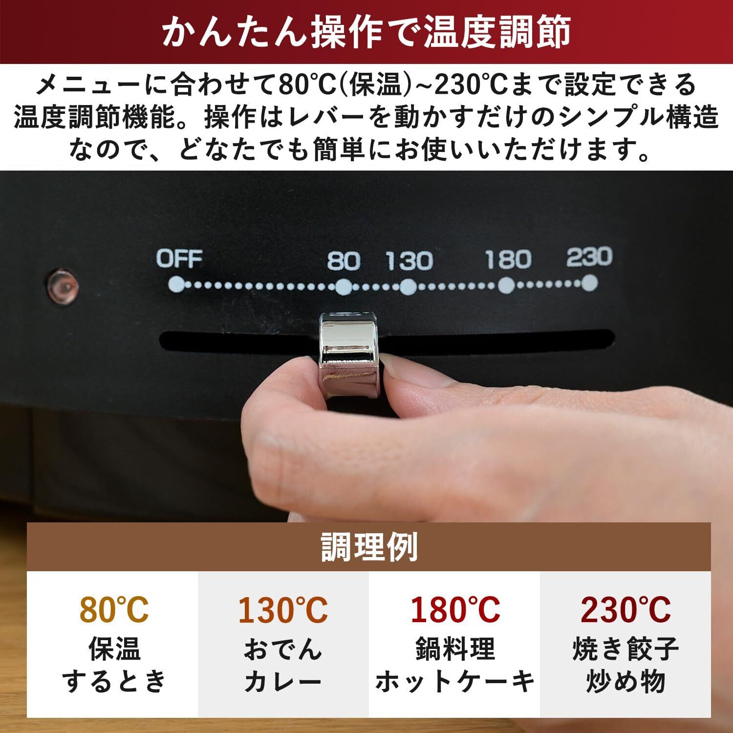 ●メニューに合わせて80℃(保温)~230℃まで設定できる温度調節機能搭載。