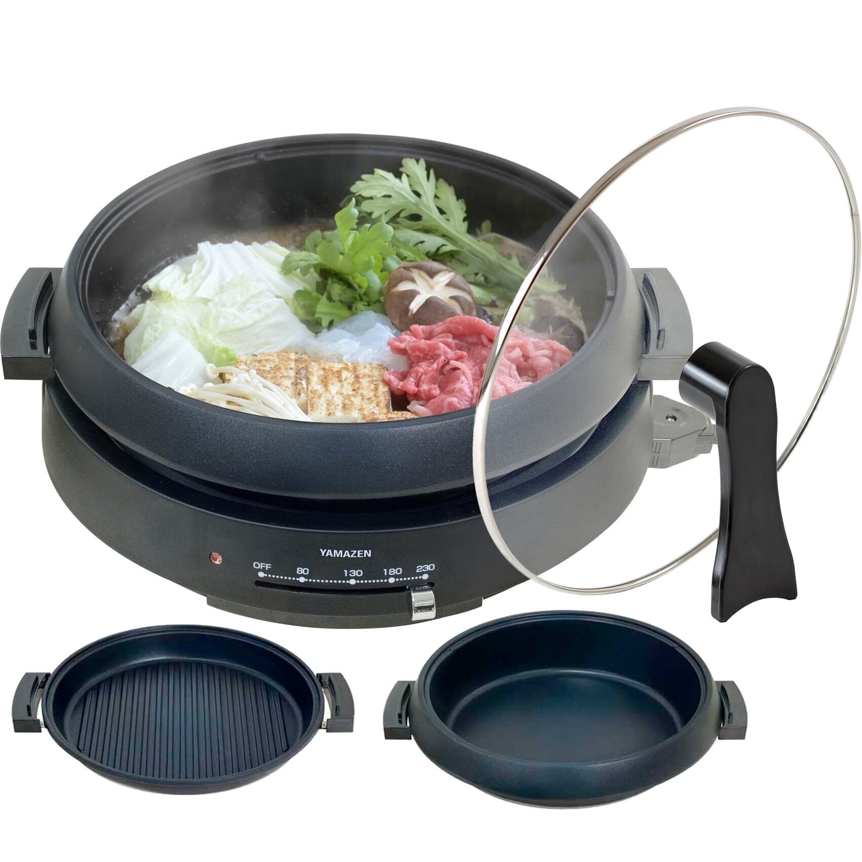 ●「焼く」「煮る」「蒸す」がこれ1台で楽しめる深鍋/波型プレートの2枚組グリル鍋。