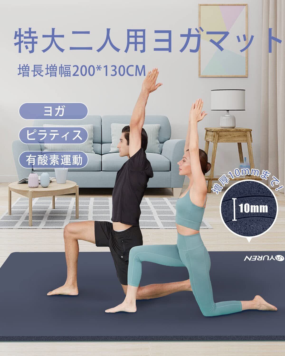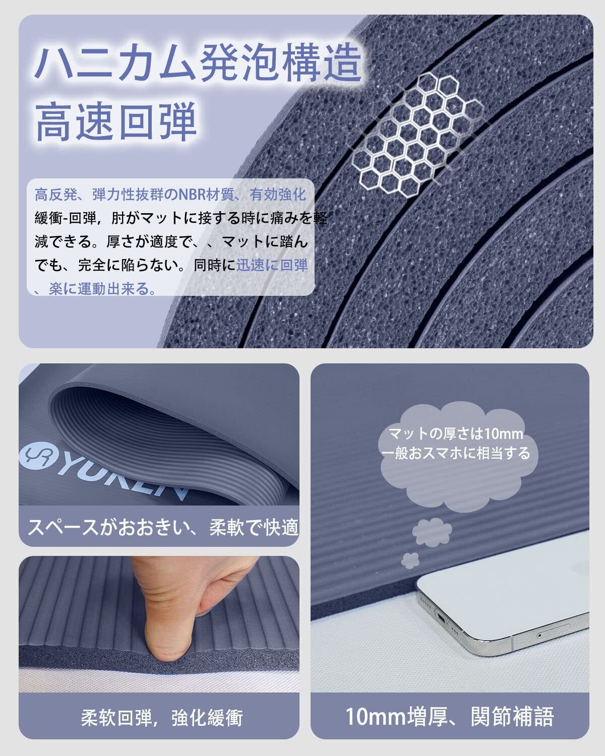 YUREN ヨガマット 厚め 10mm 幅広 130cm X 200cm トレーニングマット 大きい 高密度NBR 二人用 ストレッチ 筋トレ マット ストラップ付き