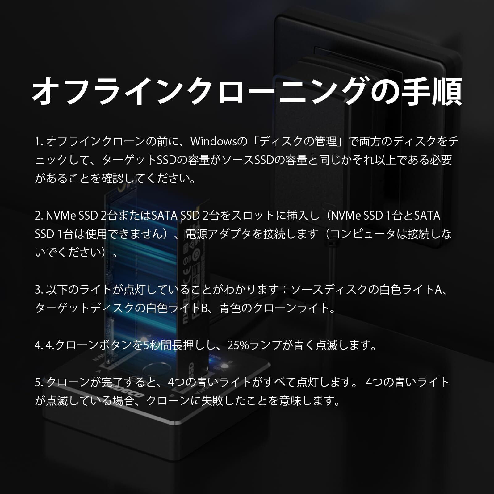 【オフライン クローンをサポート】FIDECO NVMe SSD クローン ドックはオフライン クローンをサポートし、操作が非常に簡単です。2 つの SSD をそれぞれのスロットに挿入し、クローン ボタンを 5 秒間長押しするだけで、オフライン クローンが開始されます。