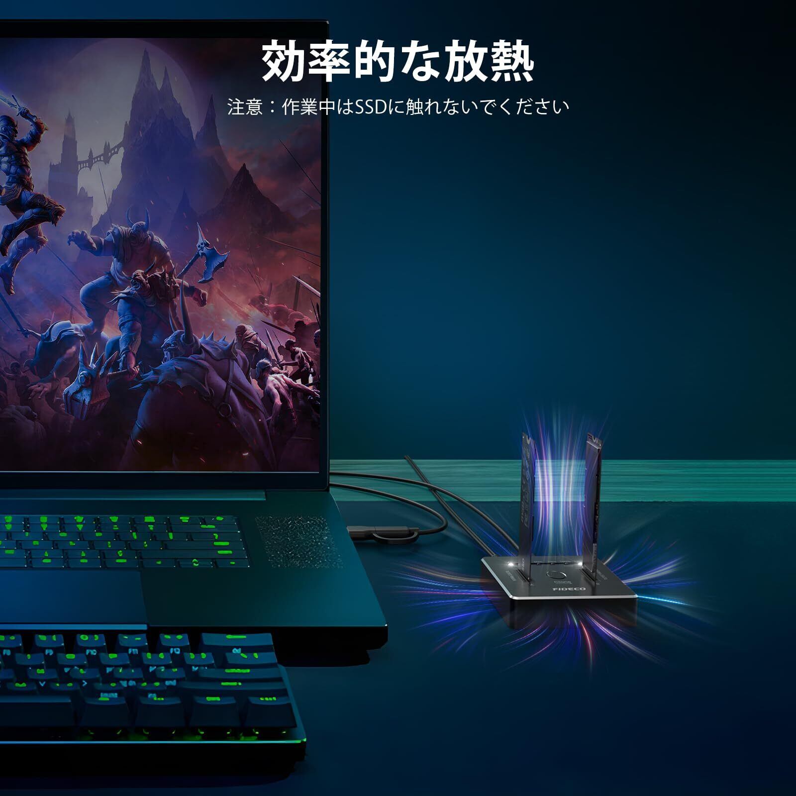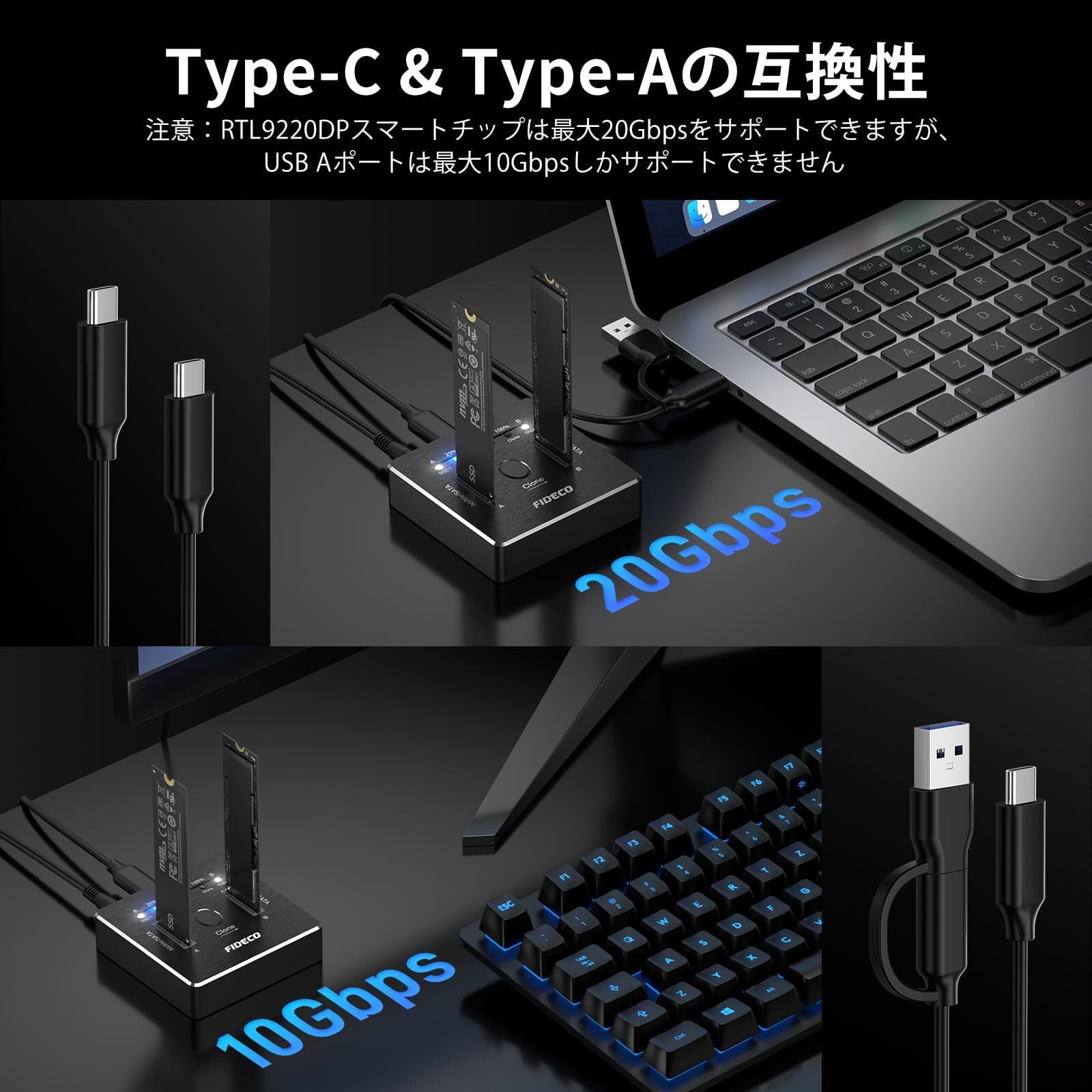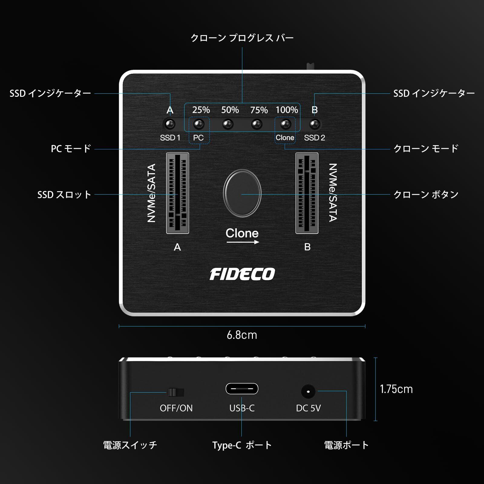 FIDECO M.2 NVMe SATA SSD クローナー ドック デュアルベイ M.2 NVME SATA SSD エンクロージャ 20Gbps M.2 NVMe SATA SSD ドッキングステーション USB 3.2 Gen 2 NVMe クローン ドッキングステーション M.2 オフライン クローン UASP トリムをサポート アルミニウム設計