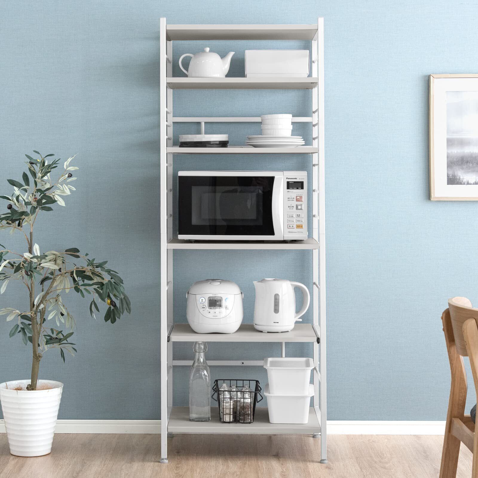 タンスのゲン レンジラック 幅60cm 大型レンジ対応 高さ168.5cm 高さ調節 スライド棚 レンジ台 キッチンワゴン ラック キッチンラック オープンラック スリム おしゃれ グレージュ 49200001(96681)