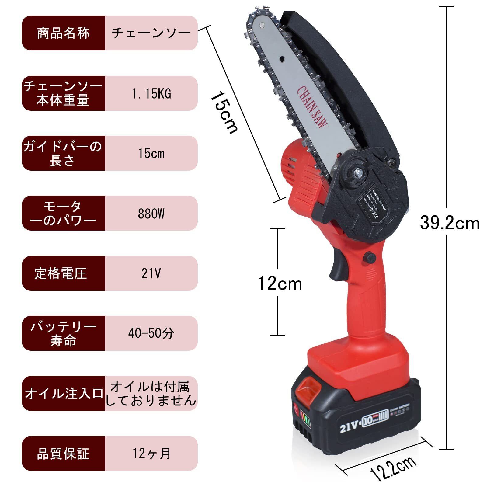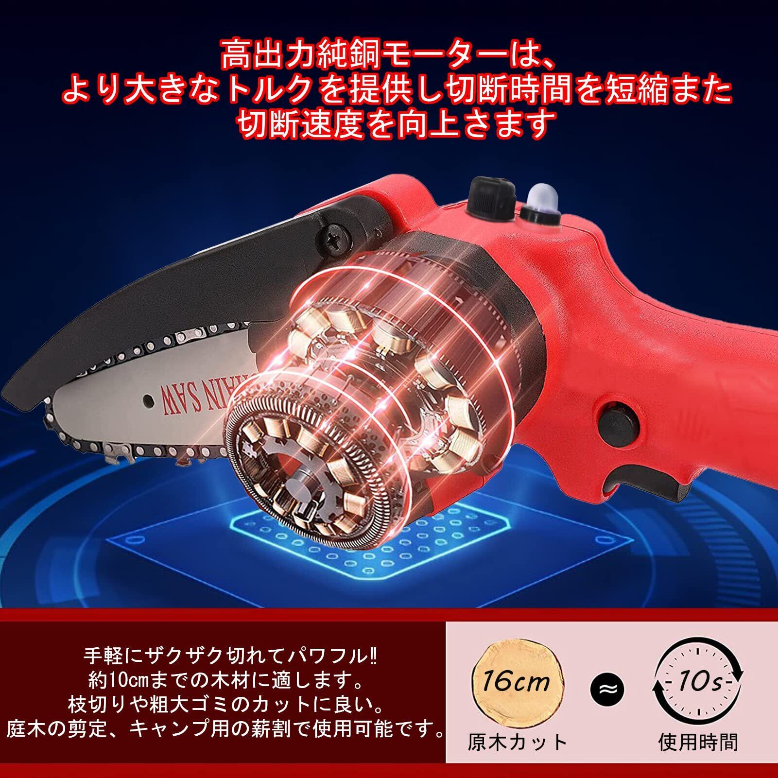 チェーンソー 充電式 21V 3.0Ah大容量バッテリー2個搭載(マキタ バッテリー対応)電動チェーンソー 給油システム 小型チェーンソー LEDバッテリー残量表示 強力 軽量 片手 木工切断、薪作り、園芸設備、枝切り、庭木の剪定、竹の伐採等 充電式チェーンソー 電動のこぎり 日本語取扱説明書付き HQYYDS001 (6インチ)