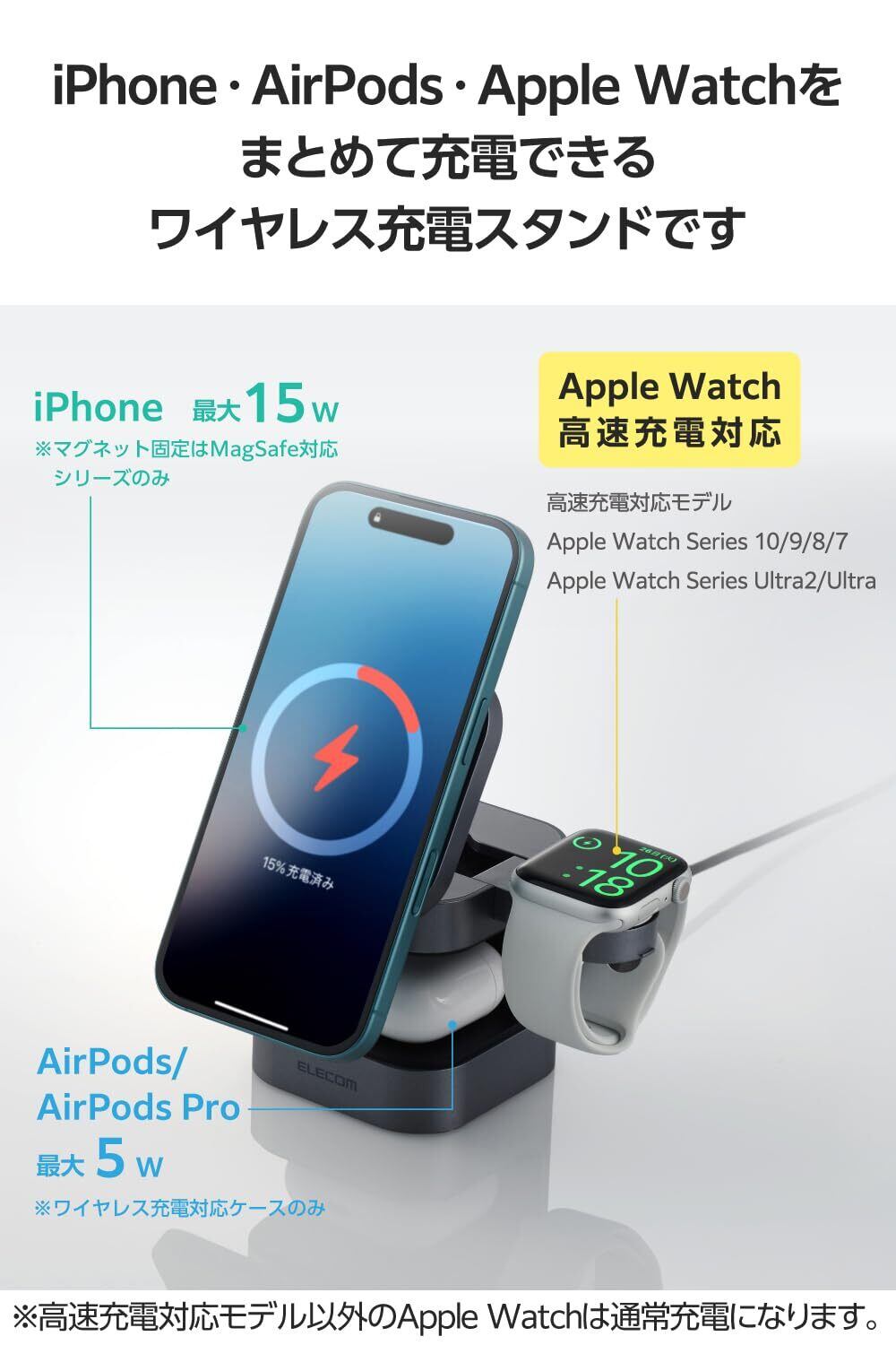 ■対応機種:スタンド部:Qi2(MPP)15W規格のワイヤレス充電に対応した機器、AirPods向けQi部:ワイヤレス充電に対応したAirPodsシリーズ(2024年10月現在)、Apple Watch充電部:Apple Watchシリーズ