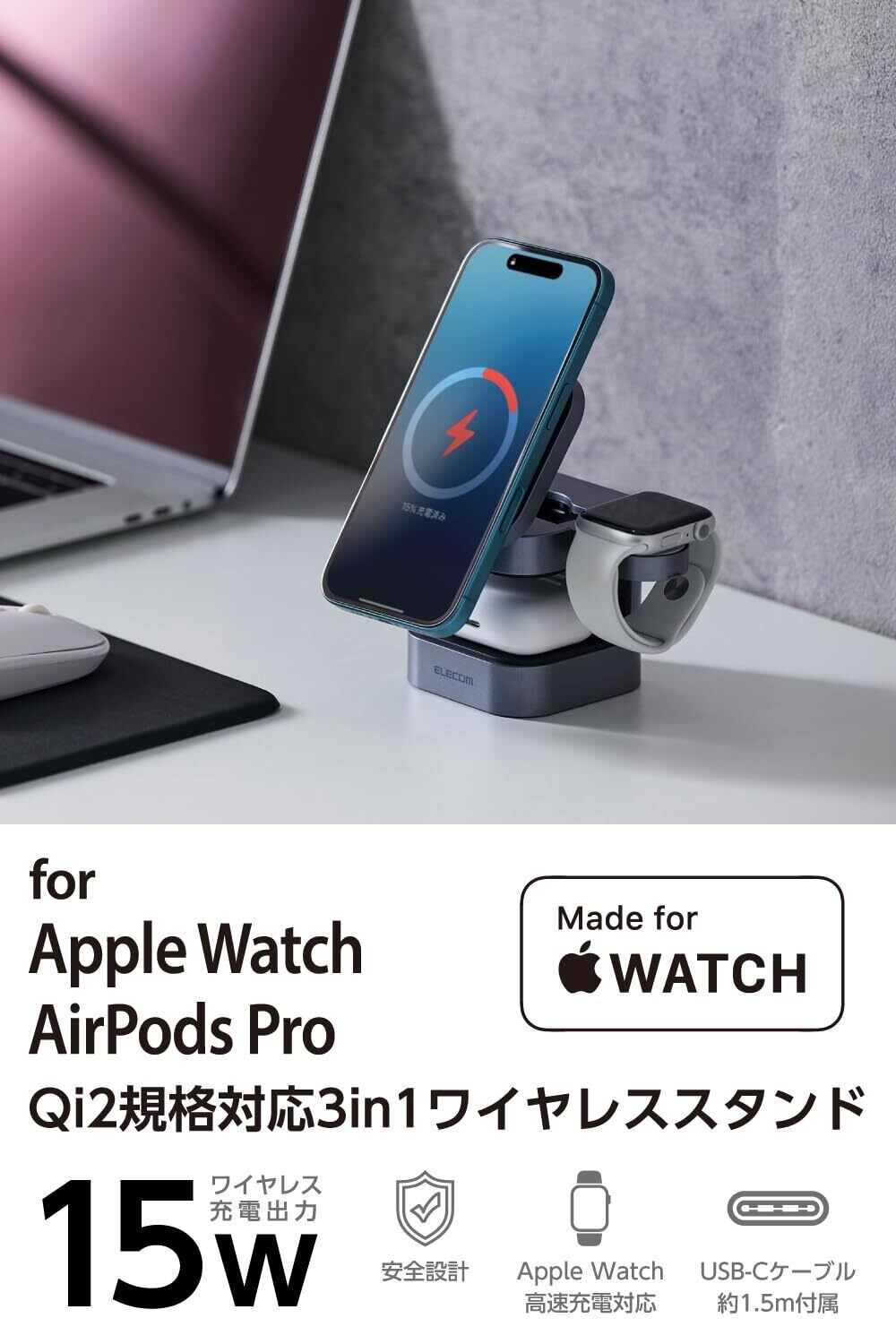 エレコム Qi2 充電器 ワイヤレス 15W 3in1 Apple Watch 認証モジュール付き スタンド型 ブラック EC-MS09BK
