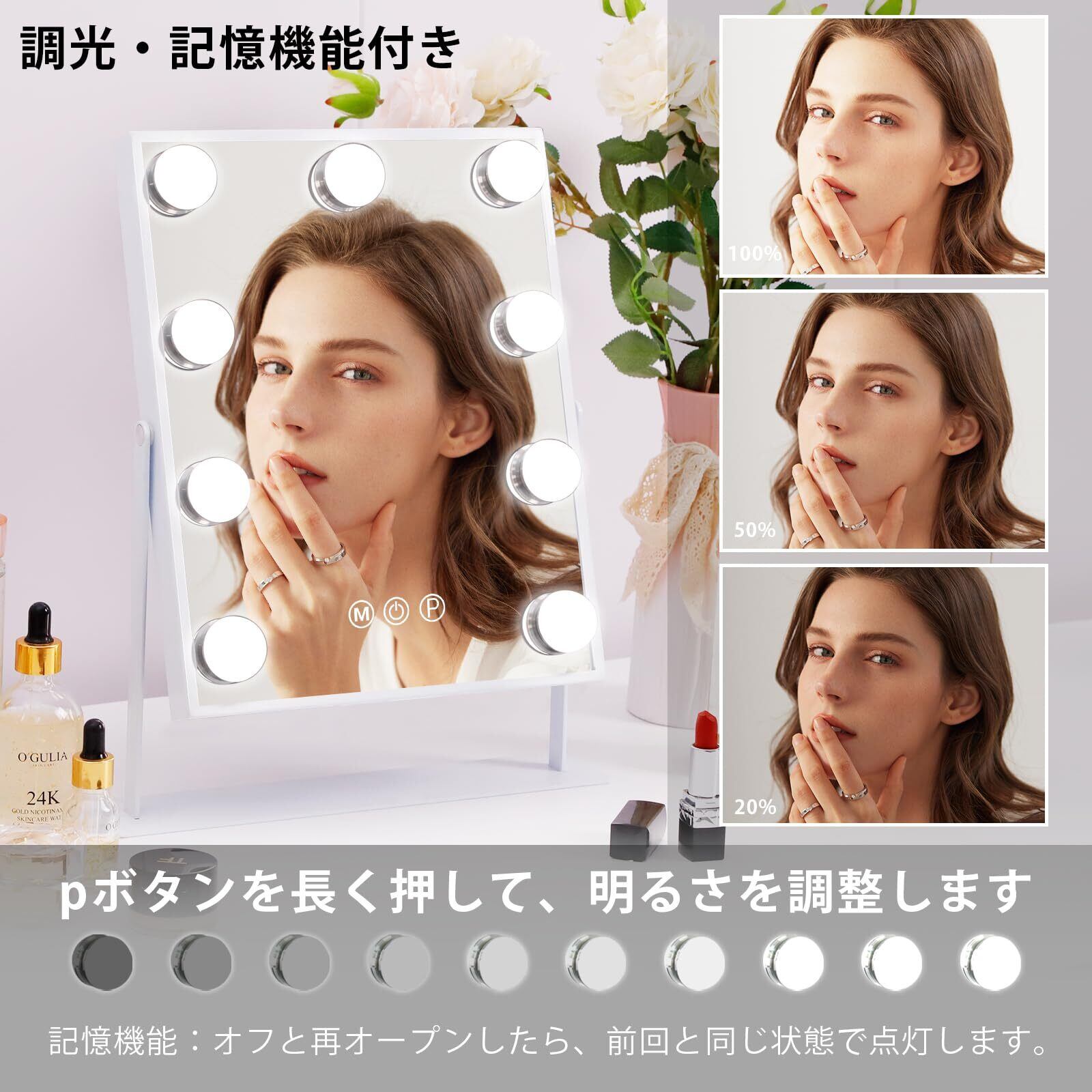 縦長タイプ女優ミラー:ちょうどいいサイズ女優ミラー、顔全体はもちろん、デコルテまで映せ、上半身の服装の雰囲気、ヘアスタイルとメイクのバランスを確認できます。9個大きなハリウッド式LED電球を採用し、時間帯や部屋の明るさに左右されずにライトで顔を明るく照らせ、女優さんの気分でメイクを楽しめます。