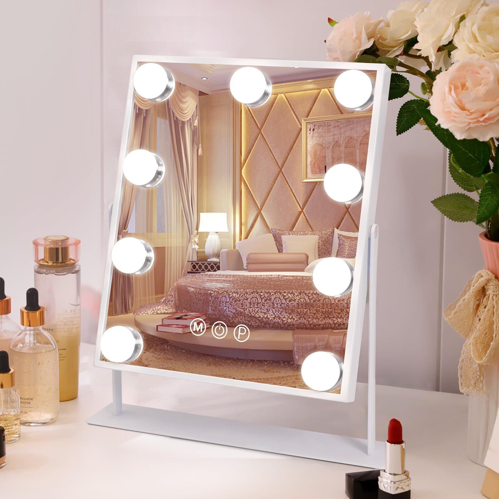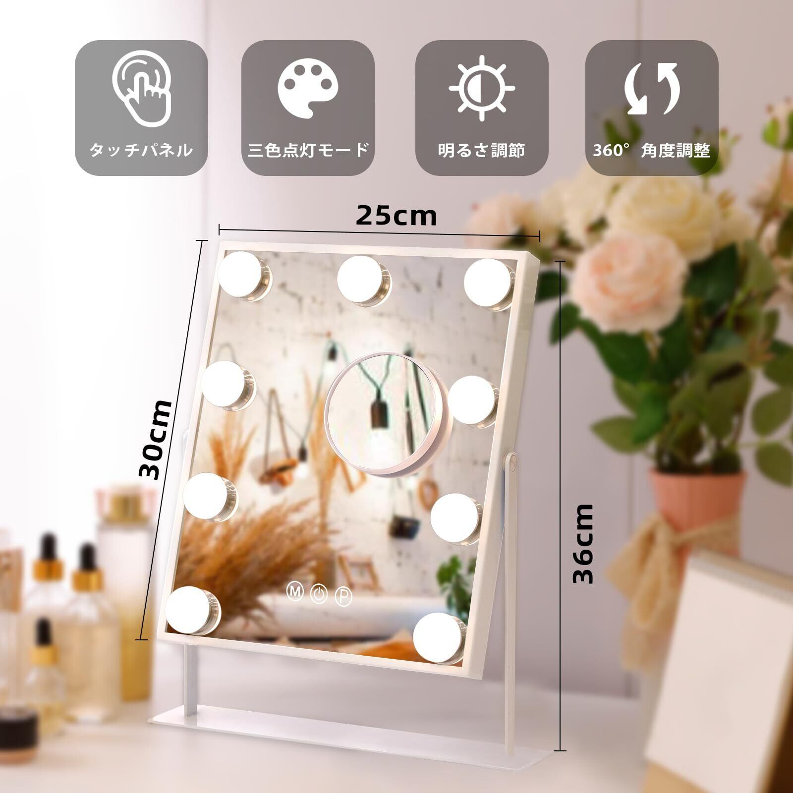 Fenair 化粧鏡 女優ミラー メイク 鏡 卓上 ライト付き 卓上ミラー LED ミラー ハリウッドミラー 9個 ハリウット電球 三色点灯モード 無段階調光 10倍拡大鏡付き 25x30cm