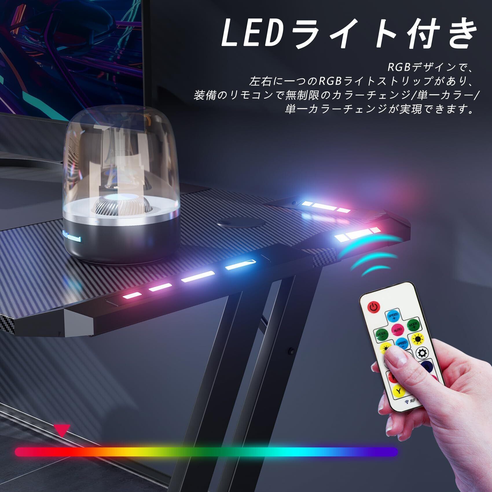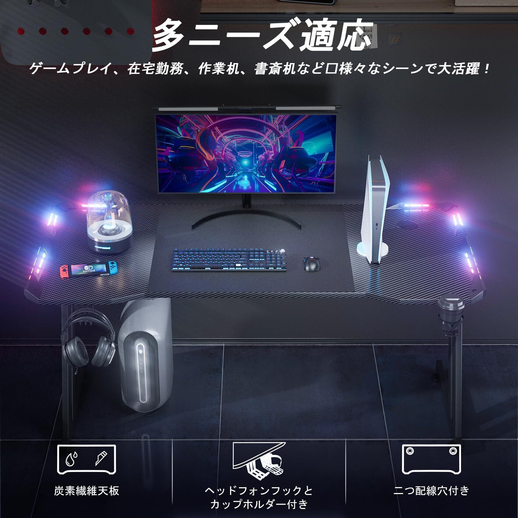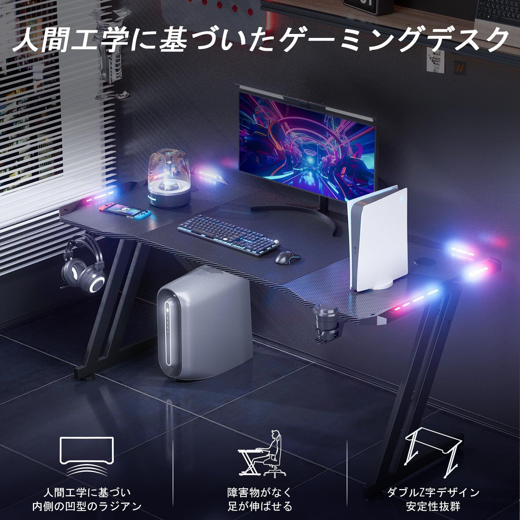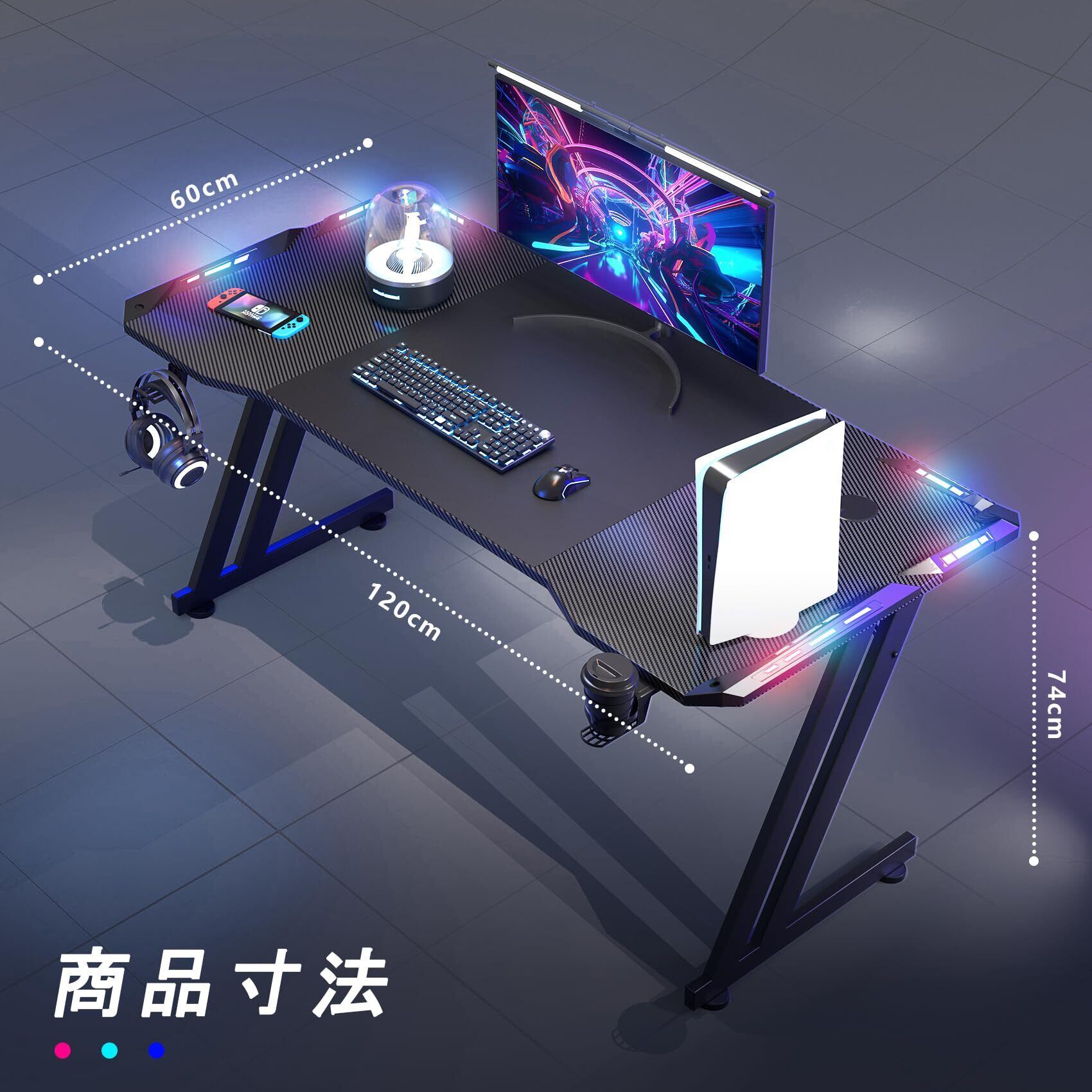 LEDゲーミングデスク「メーカー一年保証」幅120 cm×奥行60cm Z字フレーム炭素繊維天板pcデスクカップホルダーとイヤホンフック付きパソコンデスクブラック