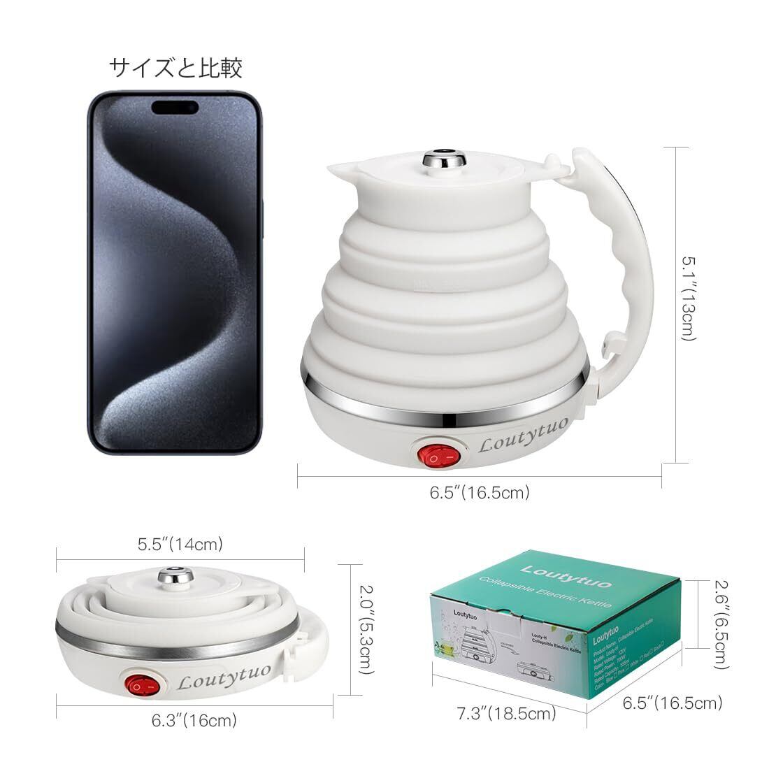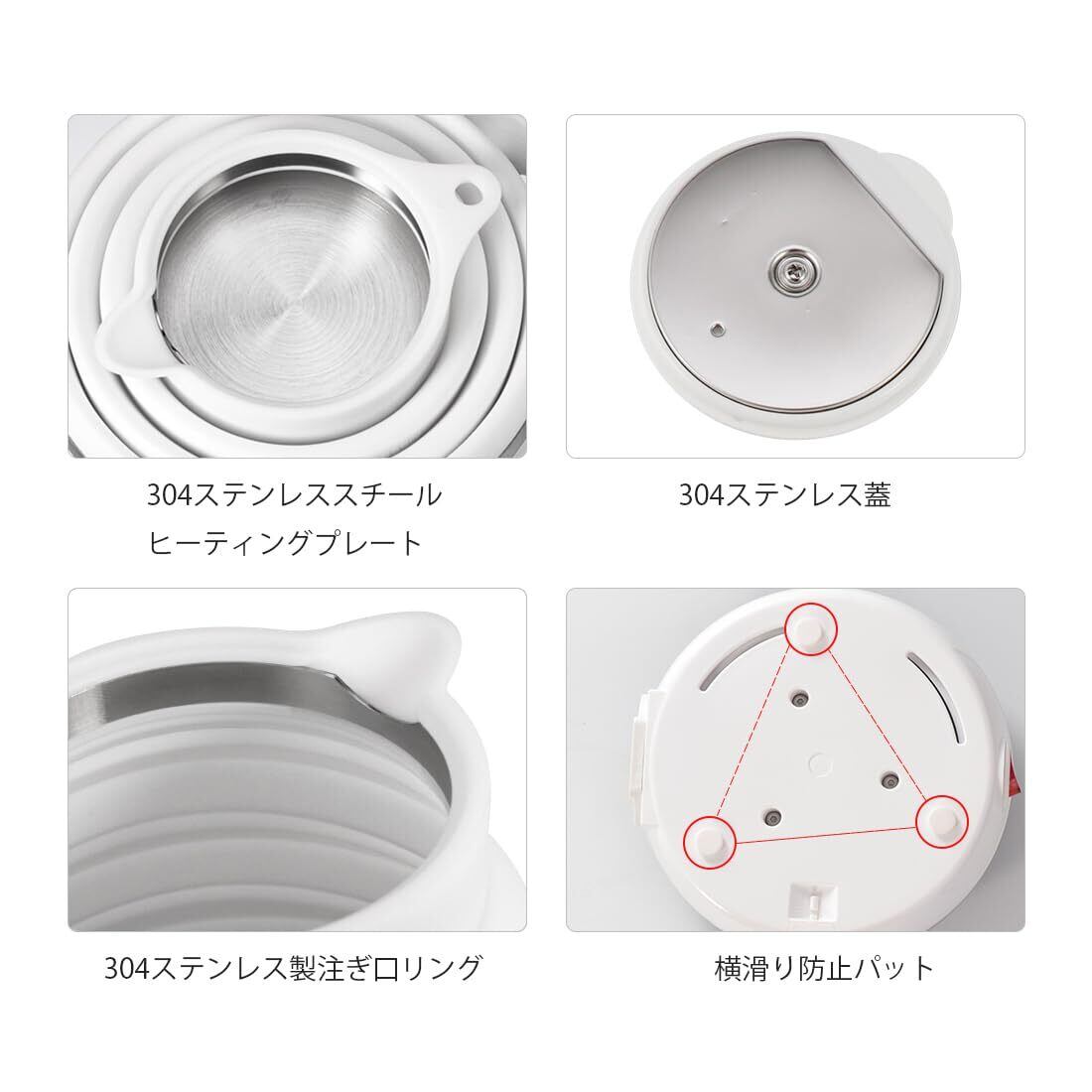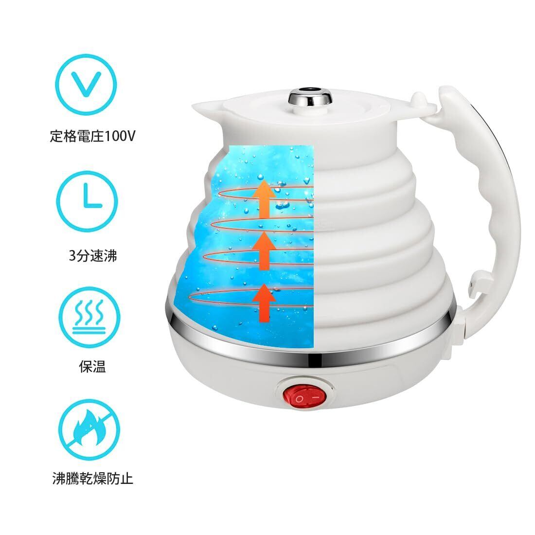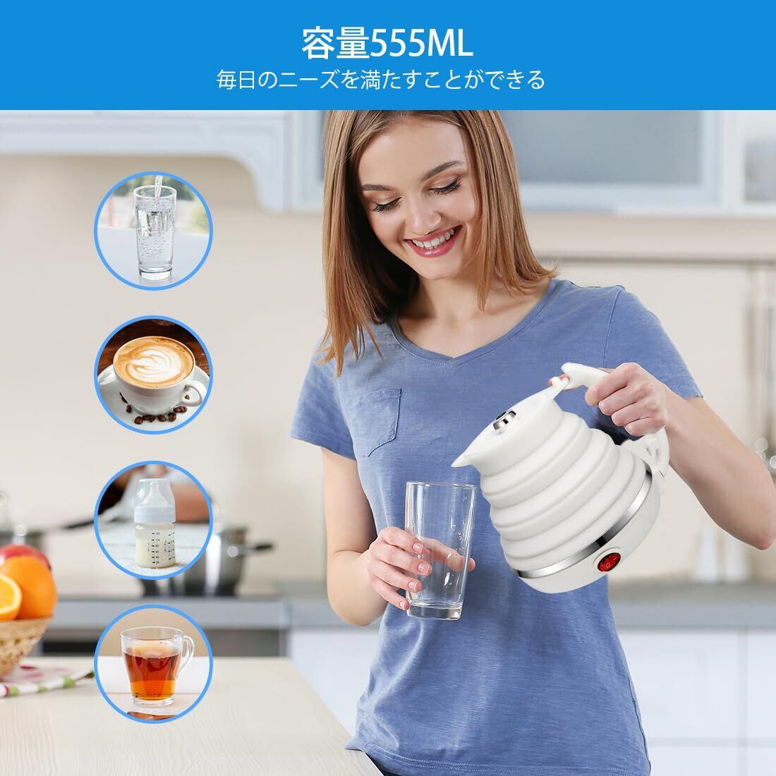 超薄型アップグレードされたシリコーン旅行折り畳み式電気ポータブルケトル、折り畳み式湯沸かし器分離可能な電源コード100V 555ML、沸騰ドライ保護 (ホワイト)