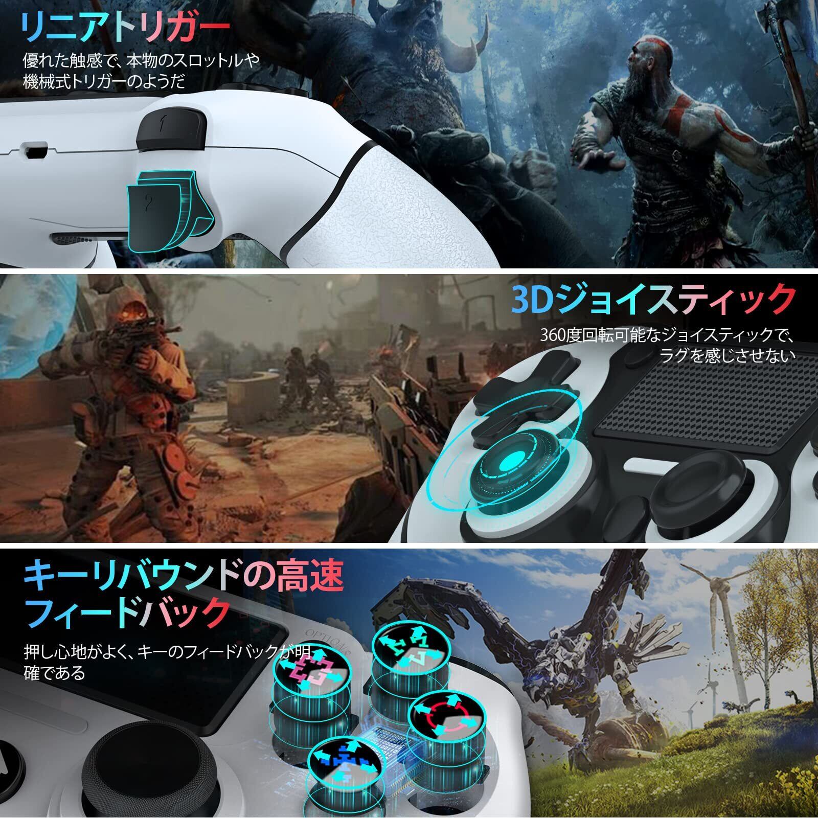 「より正確で、より敏感で、より耐久性が向上しました」プレステ4コントローラーは、人体の皮膚に近い質感の高品質なゴムで作られており、最大限の快適性を提供しています。十字キーは10万回耐久テストをクリアし、入力ミスを減らすデザインとよりスムーズな移動と感度を備え、キー反応時間を短縮しています。さらに、高感度で耐久性があり、細かい操作がスムーズに行える3D可動ジョイスティックを搭載し、耐久性が大幅に向上しています。また、高いグリップ力を持つシリコン製ジョイスティックキャップが付属し、快適なプレイと同時に指と手首の疲労を軽減できます。顧客フィードバックに基づいて、キー配置とタッチフィードバックが改善され、L2キーとR2キーがより使いやすくなっています。また、白いテクスチャーのグリップデザインにより、長時間の使用にも耐え、疲れにくく、緩みにくく、汚れにくくなっています。このプレステ4 コントローラーを使用して、あなたのゲームレコードを打破し、ゲームの限界に挑戦し、より強力になりましょう。
