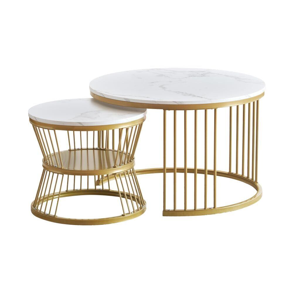 センターテーブル テーブル ローテーブル 大理石調 波紋 収納付 おしゃれ 入れ子式 円型 丸型 2個セット 鏡面 光沢感 収納付 組み合わせ自由 (ホワイト+ゴールド)