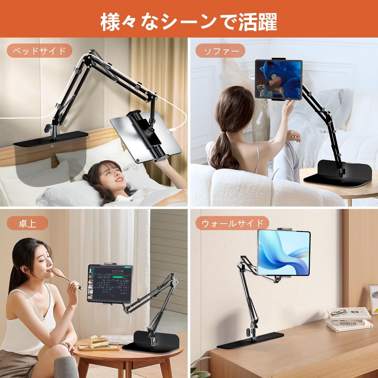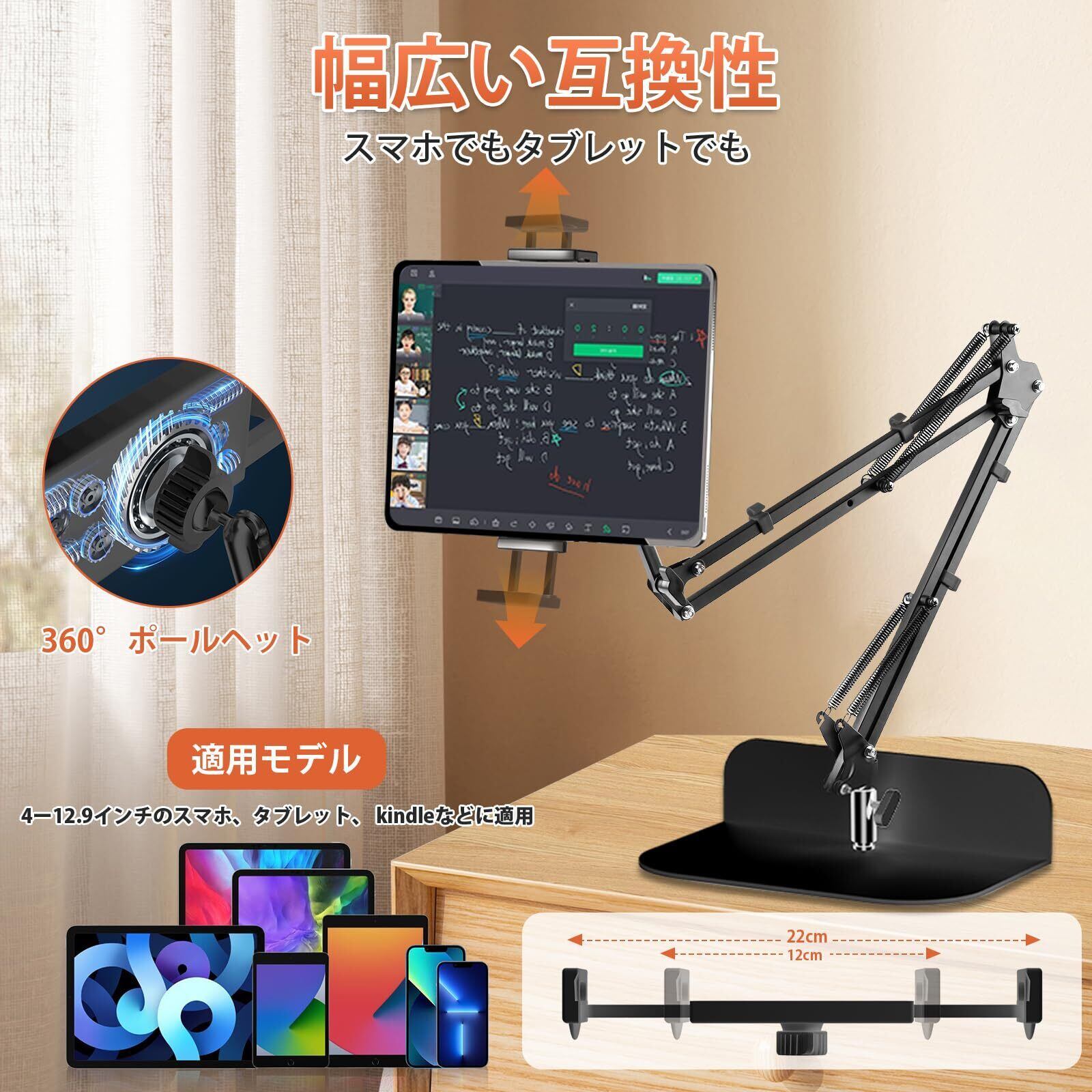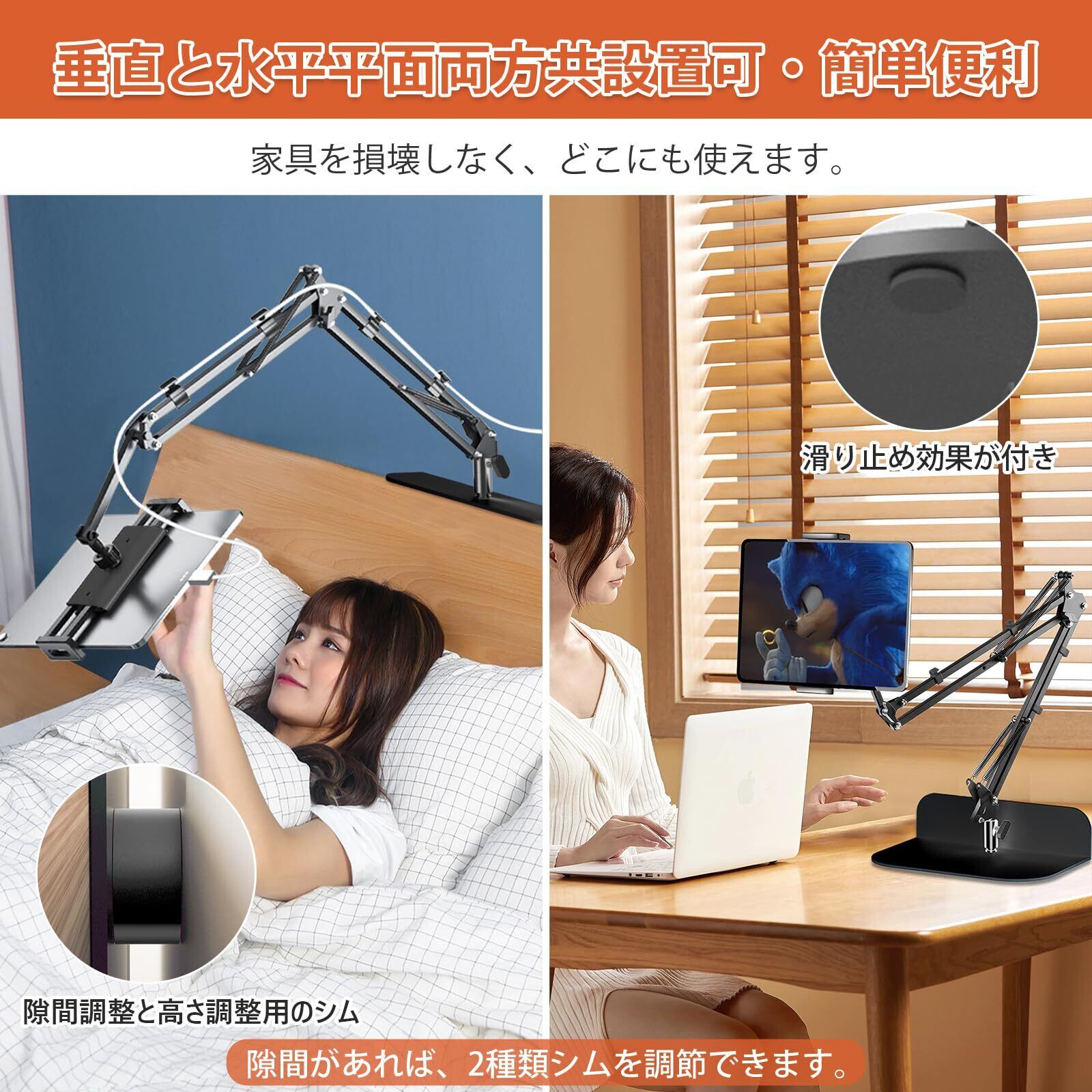 【高品質の素材、安全で安定】このタブレット スタンドは高品質の金属素材で作られており、頑丈で耐久性があります。アームを厚くすることで、耐荷重が強くなり、重いものを掛けても安定性を維持し、デバイスの落下を防ぎます。付属の滑り止めパッドは、家具の表面を傷や損傷から効果的に保護保護します。