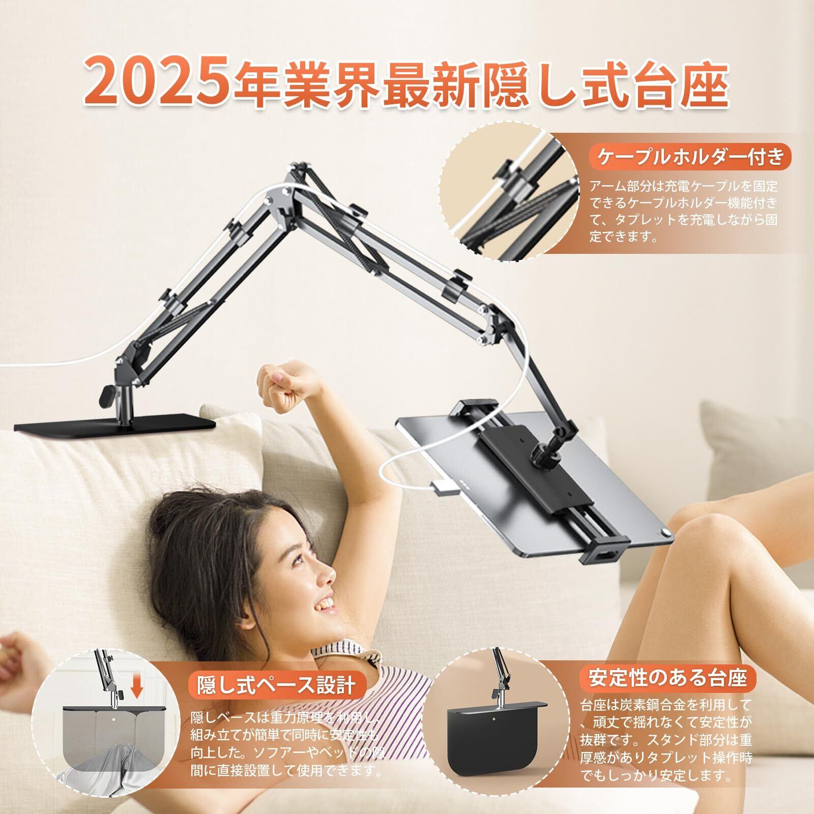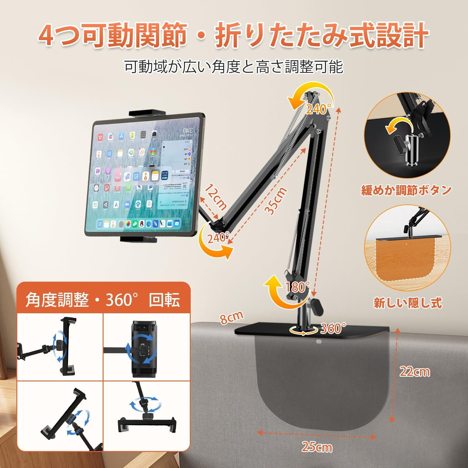 ipad スタンド【冬に両手を解放!家具に傷がつかない!】タブレット スタンド スマホスタンド 隠し式台座 多機種対応 4-12.9インチ アイパッド スタンド 360°回転 折り畳み式 卓上 縦横置き ベッド 寝ながら 自由調整 安定 iPhone&iPad&switchアームスタンド (ブラック) Panovol