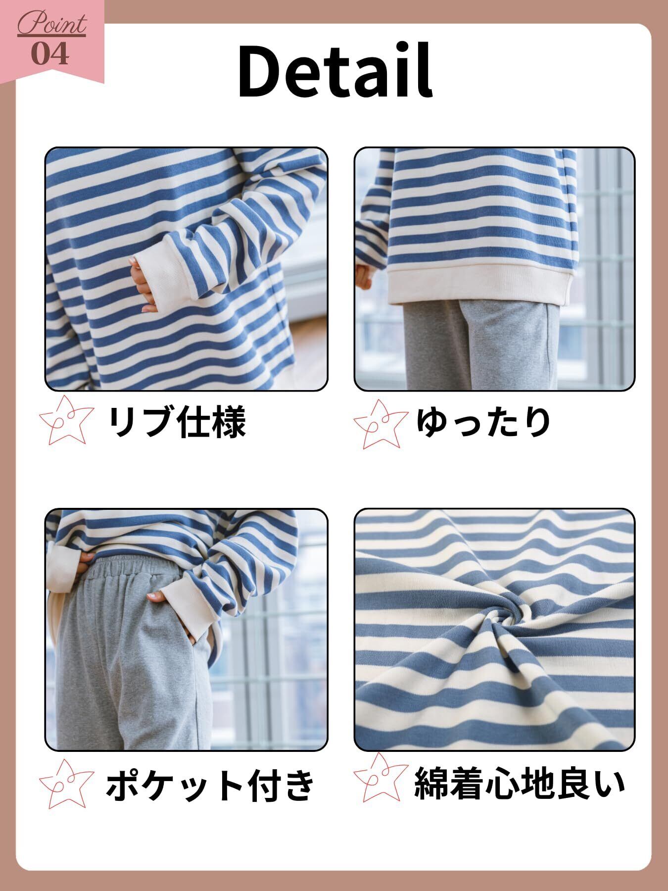お肌に優しい自然素材上質な綿100%を採用しており、快適な履き心地で肌触りの良いパジャマセットアップです。