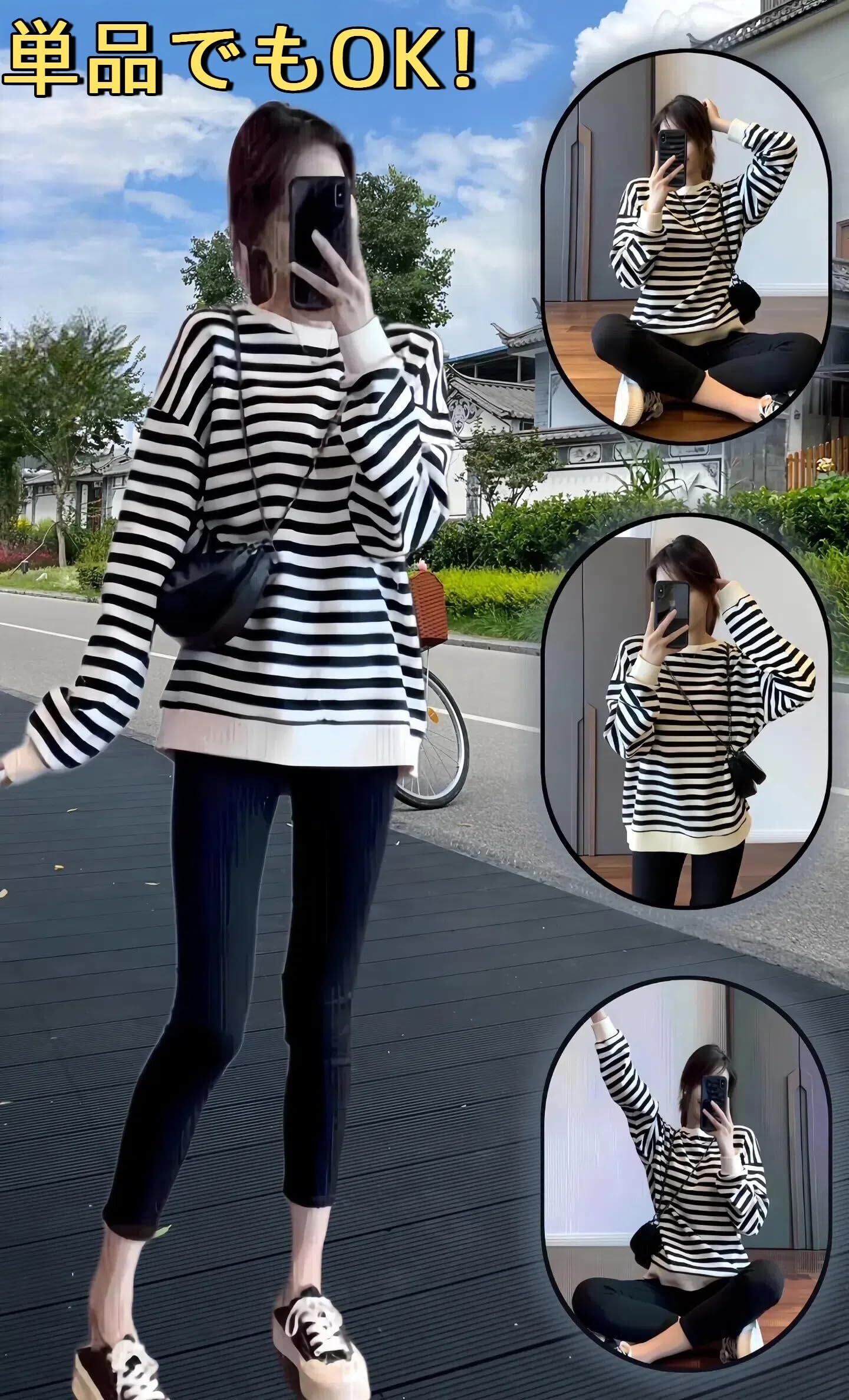トップスは肩幅にゆとりがあるドロップショルダーで体のラインを拾わない、ゆったりとしたシルエットで体型カバーもOK。