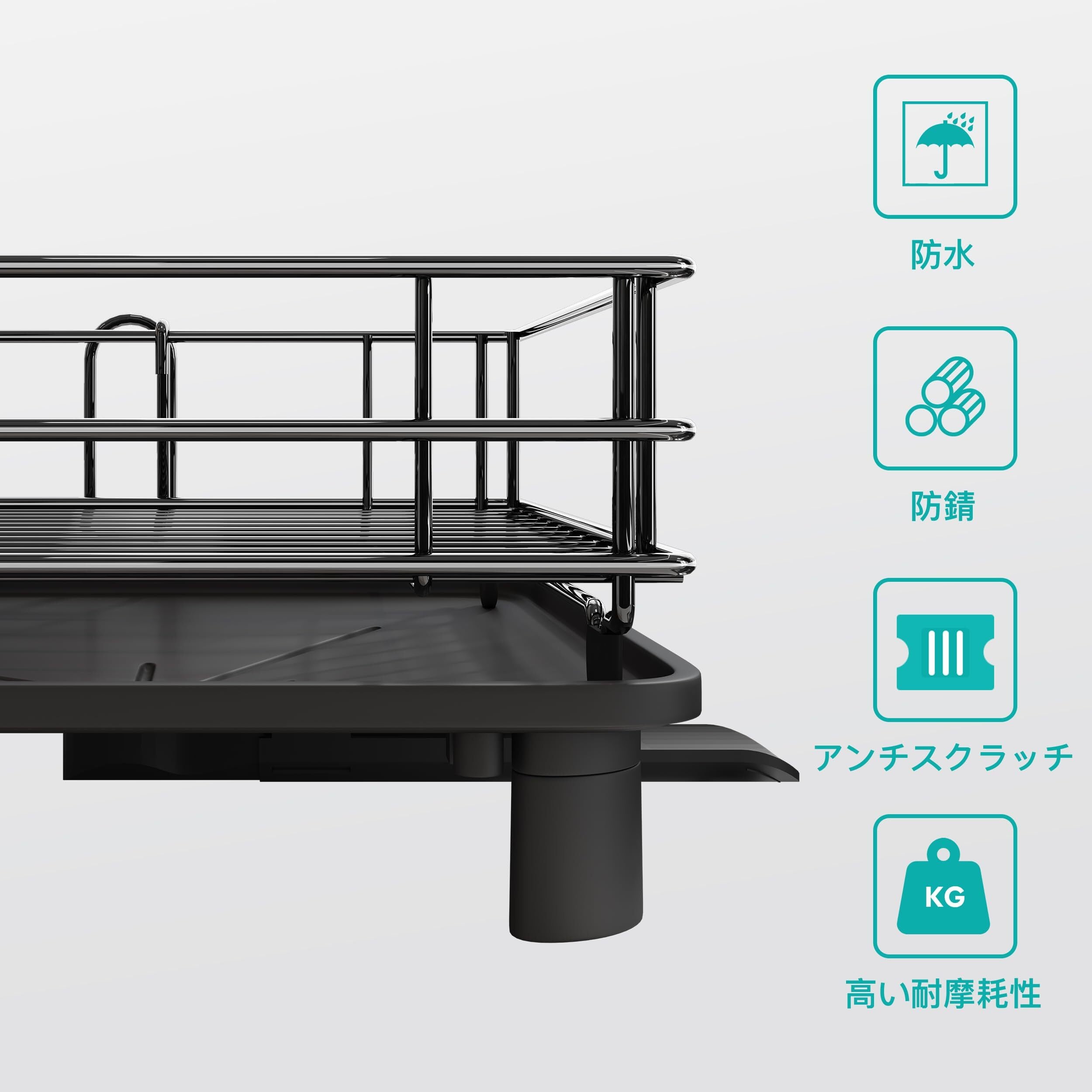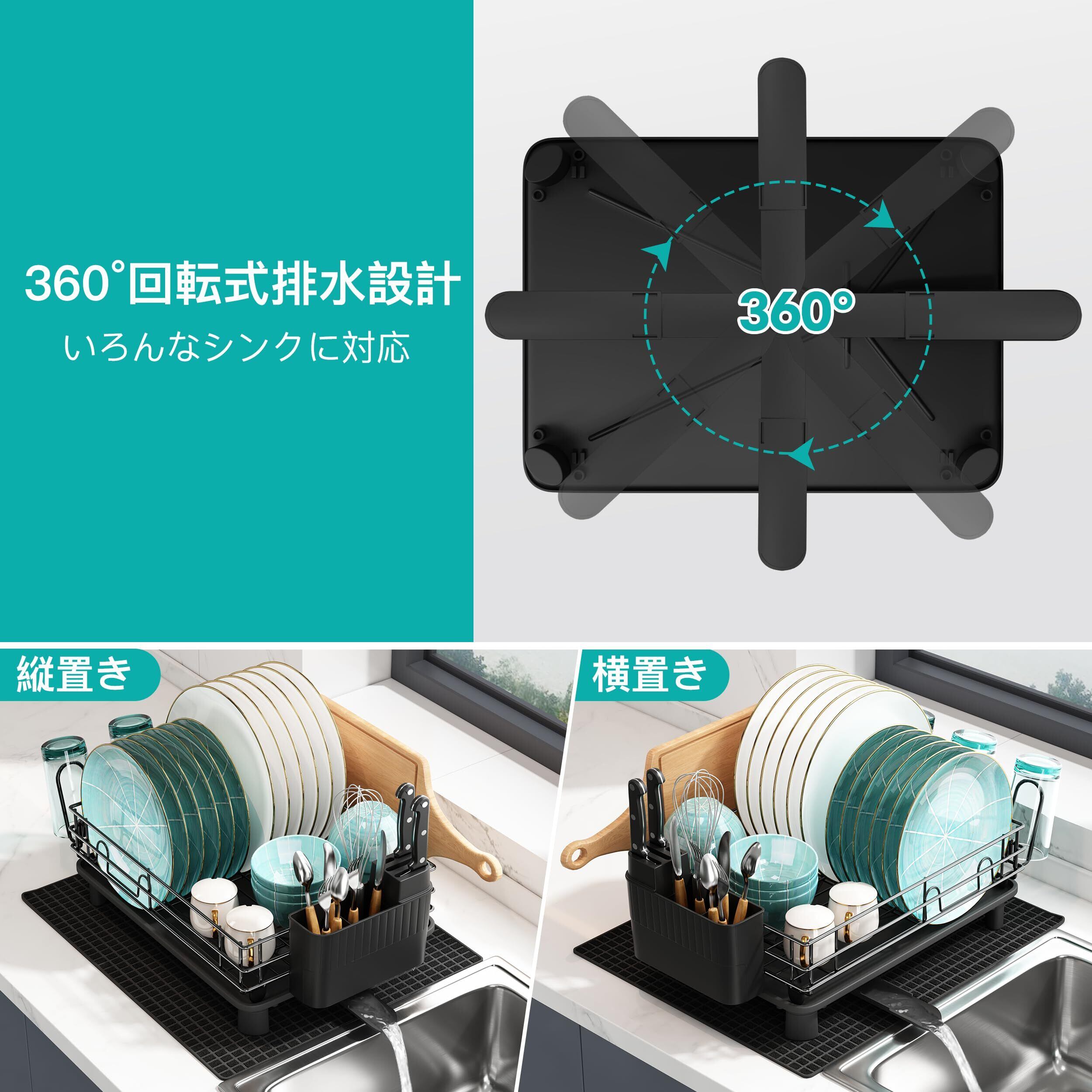 【排水便利】受皿底部の中間に排水路を接続し、360回転が可能で、しかも長さが調節できて面倒な水出しに別れを告げることができ、水切りラックに水が溜まらず衛生を守ります。受け皿に溜まる水にさよなら!DIYで置くことができ、キッチンスペースを最適に利用し、大容量を発揮することができます。