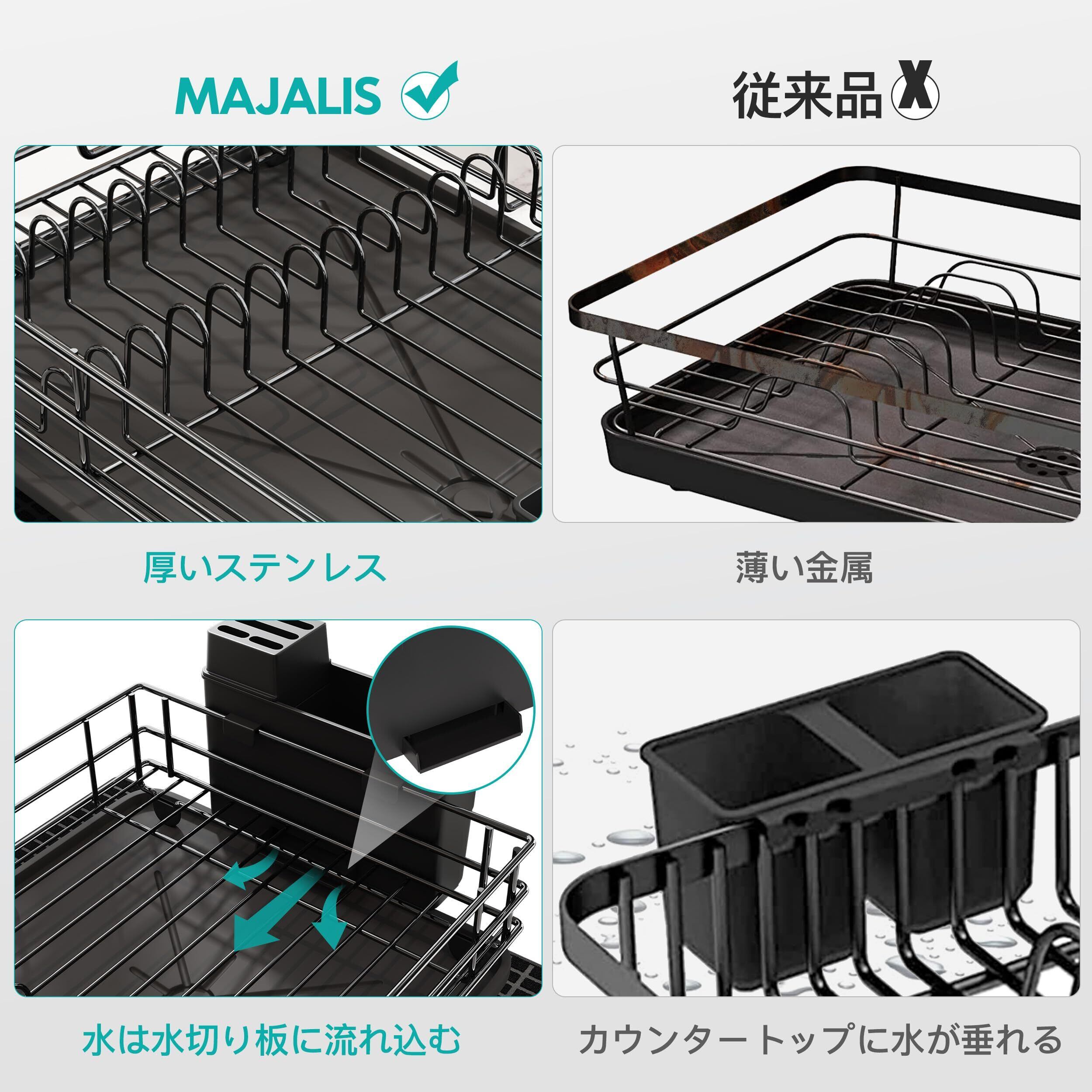 MAJALiS 水切りラック シンク上 食器ラック 水切りカゴ 台所 包丁スタンド 箸立て 吸水マット付き 自動排水 自然乾燥可能 組み立て簡単 1段式「ブラック」長さ40.3*幅30*高さ15.3CM