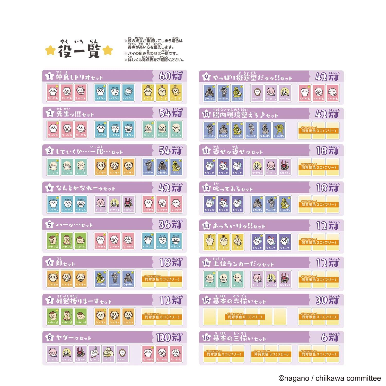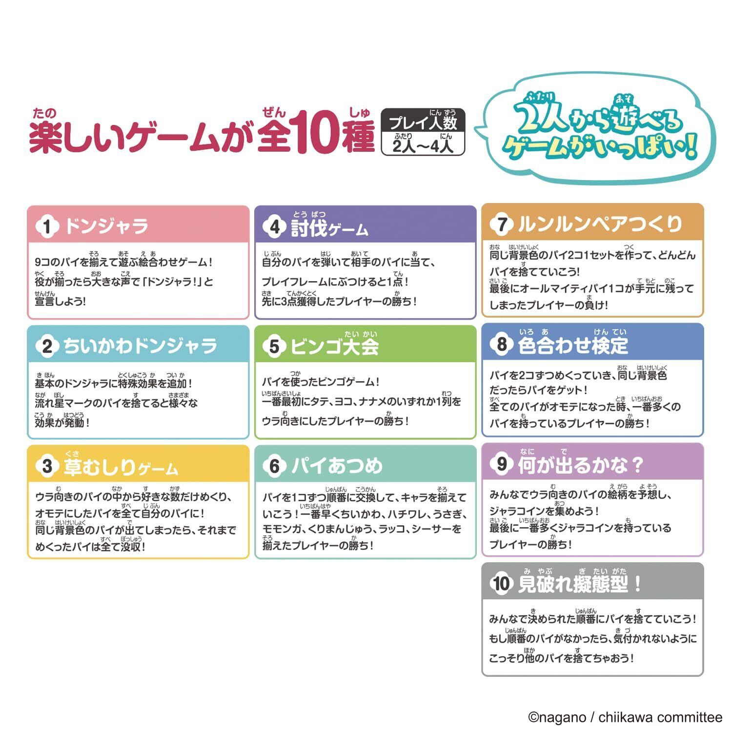 基本のドンジャラから、草むしりゲームや討伐ゲームなど「ちいかわ」の世界観を楽しめるゲームまで、 2人から遊べるゲームを10種収録。