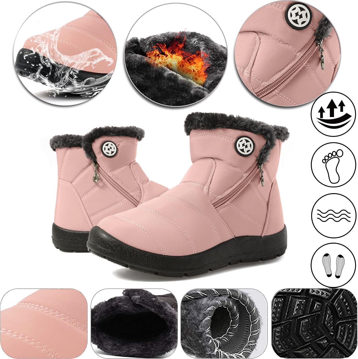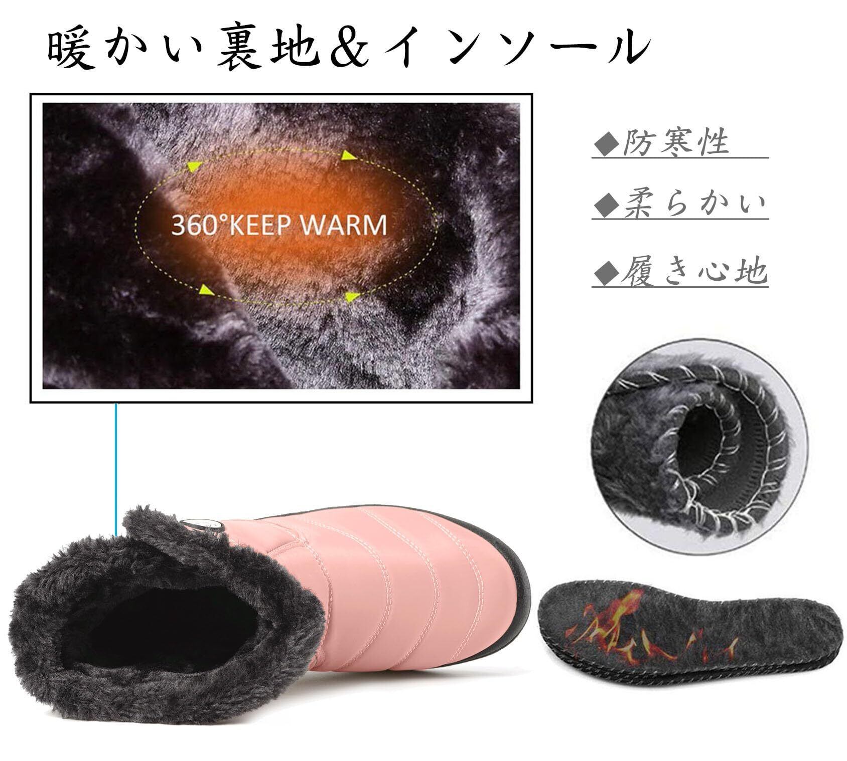 【防水性】このスノーブーツのアッパーは特別の防水加工が施されていた生地を採用して、防水性能が強くて、水が浸入しにくいですが、完全防水ではありません。雨や雪の日に長期間着用したら、水が浸入する可能性があります、どうかご注意をお願い致します。