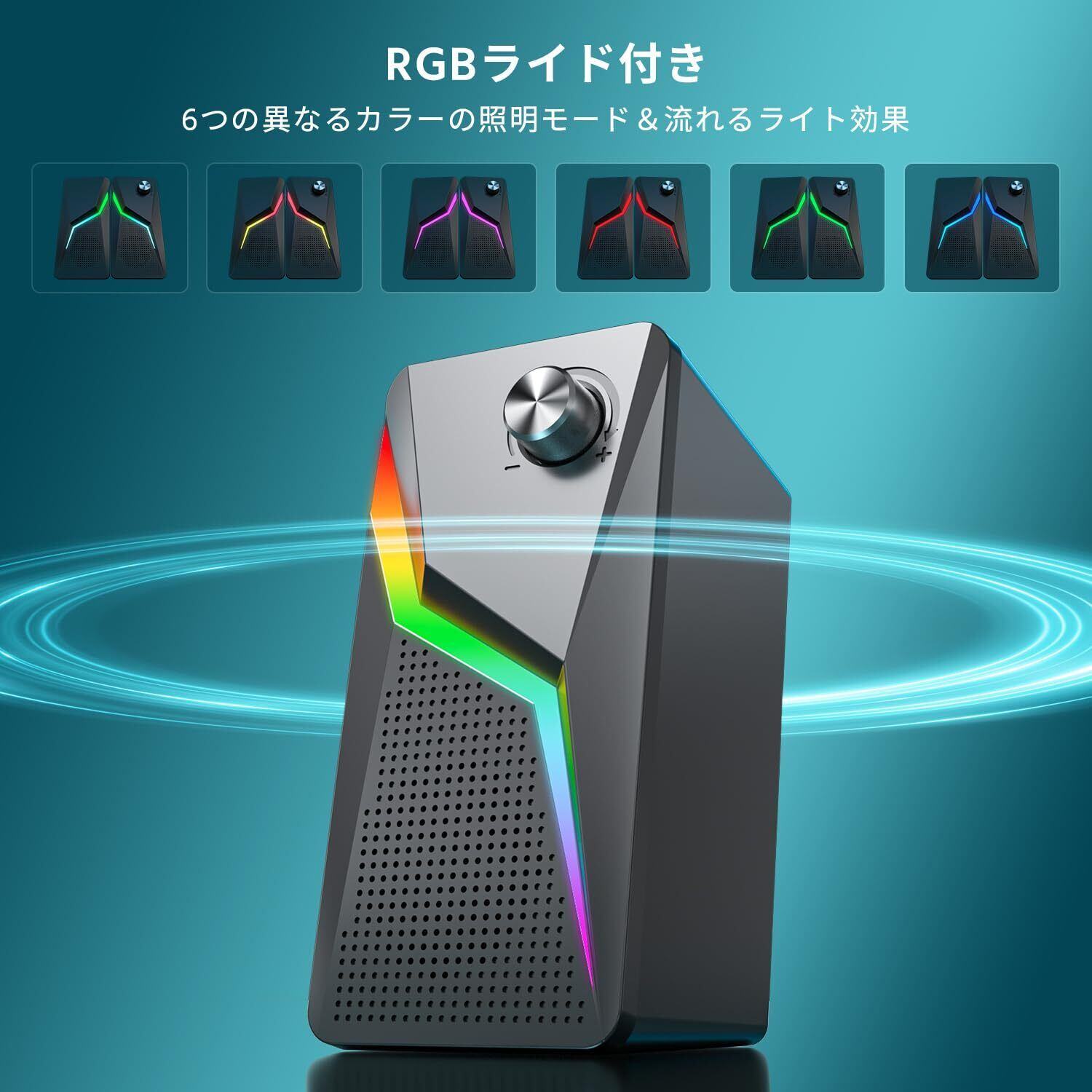 スピーカー PC ゲーミングスピーカー 有線 RGBライト付き 3.5mmケーブルが付属、USB給電式のパソコン用 テレビ、ラップトップ、タブレット、スマートフォンに対応 ブラック
