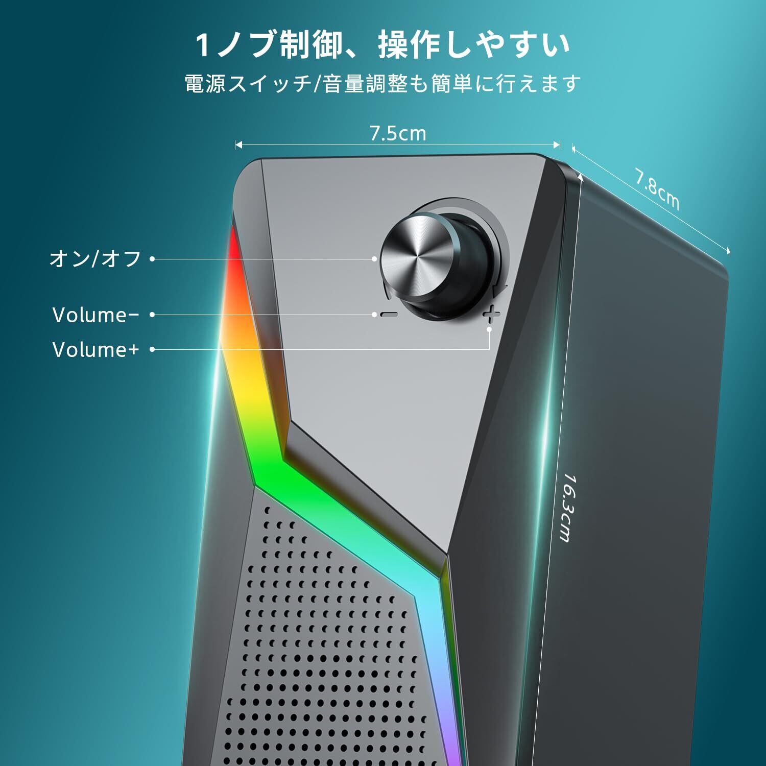 【RGBダイナミック照明効果】このスピーカーにはRGBダイナミック照明効果が組み込まれており、6つの異なるカラーの照明効果を提供できます。音楽が変化すると、照明も変化します。この効果はPCスピーカー専用に設計されており、デスクトップをカスタマイズし、ゲームや音楽鑑賞の体験を向上させてくれます。