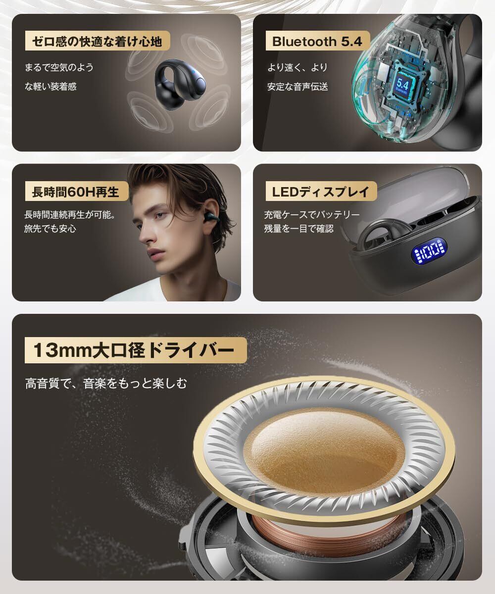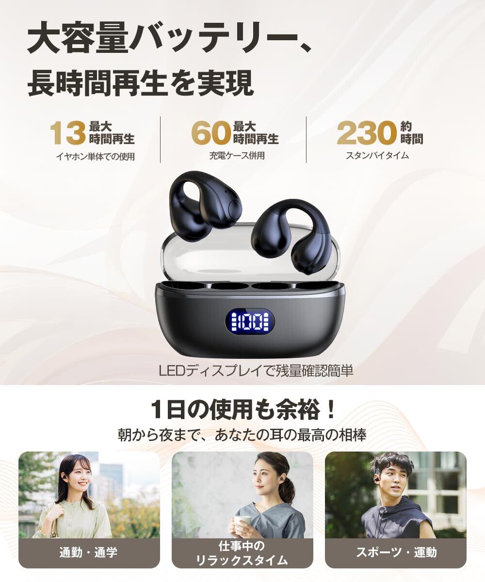 【2025新感覚・超快適設計】この ワイヤレスイヤホン は、耳を塞がない革新的なデザインで、長時間の快適な装着感を実現しました。13mm大口径ドライバーを搭載し、Hi-Fi高音質で臨場感あふれるサウンドをお楽しみいただけます。イヤホン Bluetooth 5.4技術により、より速く安定した音声伝送を実現し、最大60時間の長時間再生が可能です。充電ケースのLEDディスプレイでバッテリー残量を一目で確認でき、旅行先や外出時でも安心して使用できます。