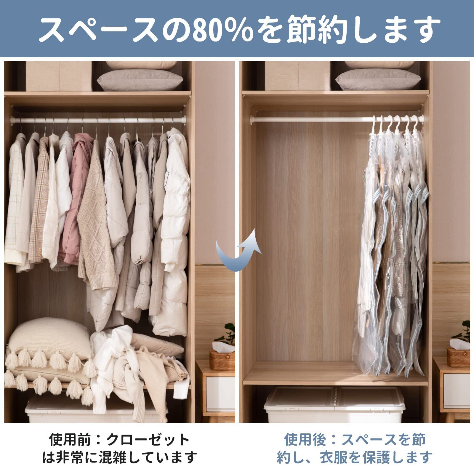 収納に大活躍:季節に合わない服がクローゼットのスペースをを占有する場合に、弊社の吊るせる圧縮袋を使用して、コートやジャケットなど入れて圧縮した後、最大80%のスペースを節約できます。また、高品質のPAとPE材質で作られるので、柔らかくて破れにくくて、再利用可能です