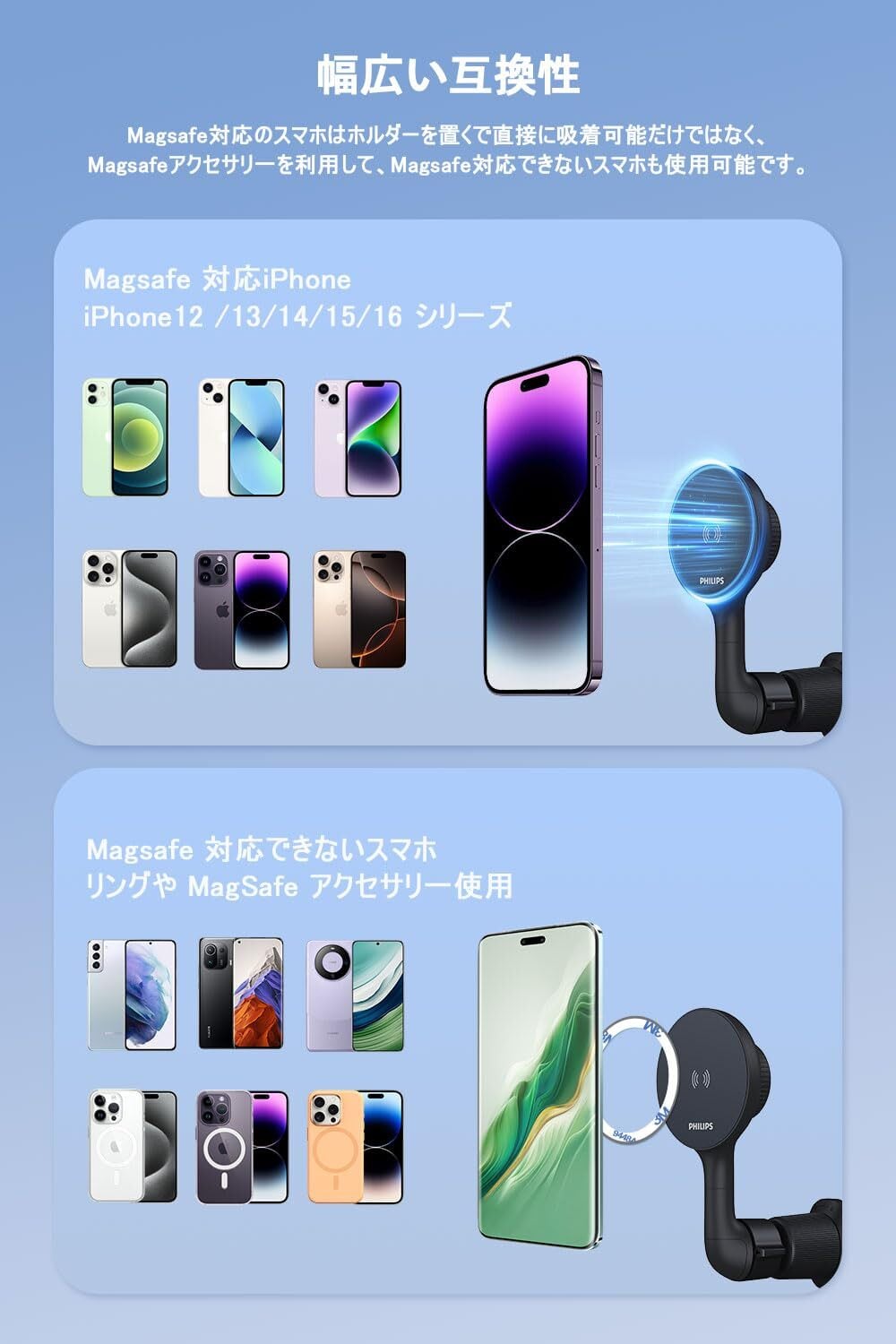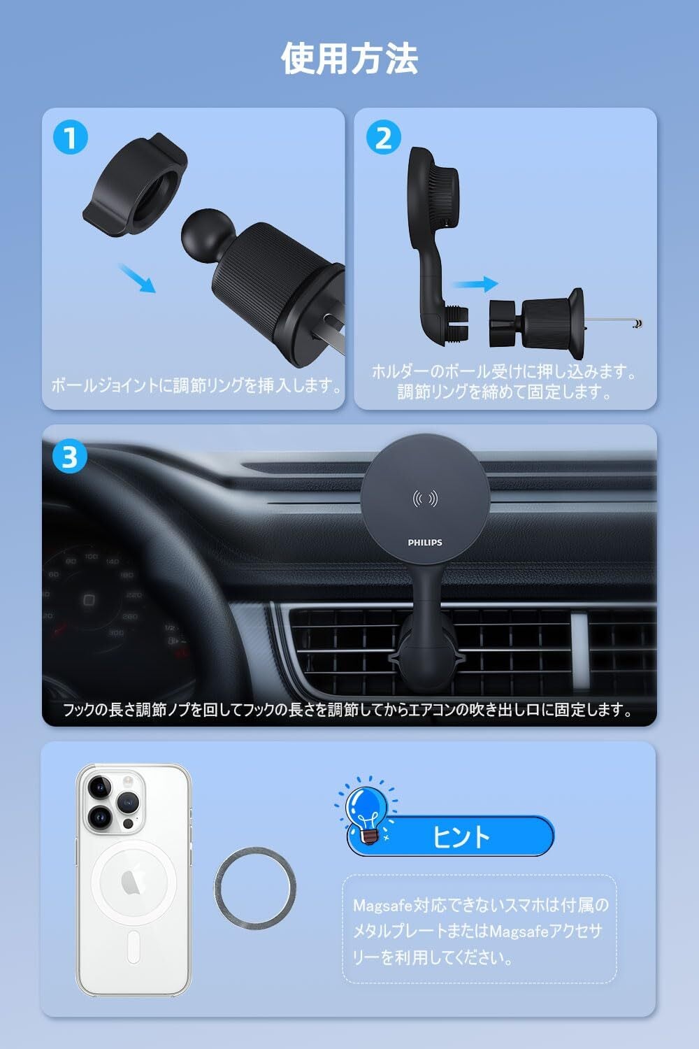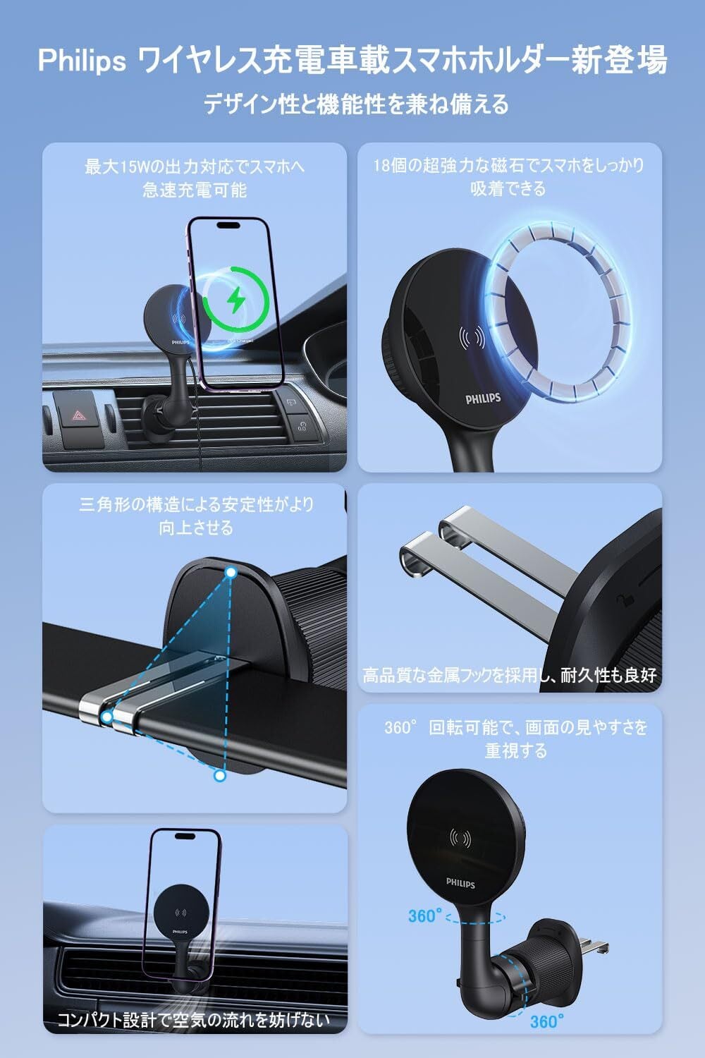 Philips (フィリップス) 車載スマホホルダー マグネット エアコン 吹き出し口 15W急速充電 金属フック magsafeホルダー 超強磁力 瞬間吸着 360°回転可能 マグセーフ携帯ホルダー 片手操作 コンパクト設計 車用ホルダー カー用品 ほとんどの車種/機種対応 DLK4251Q