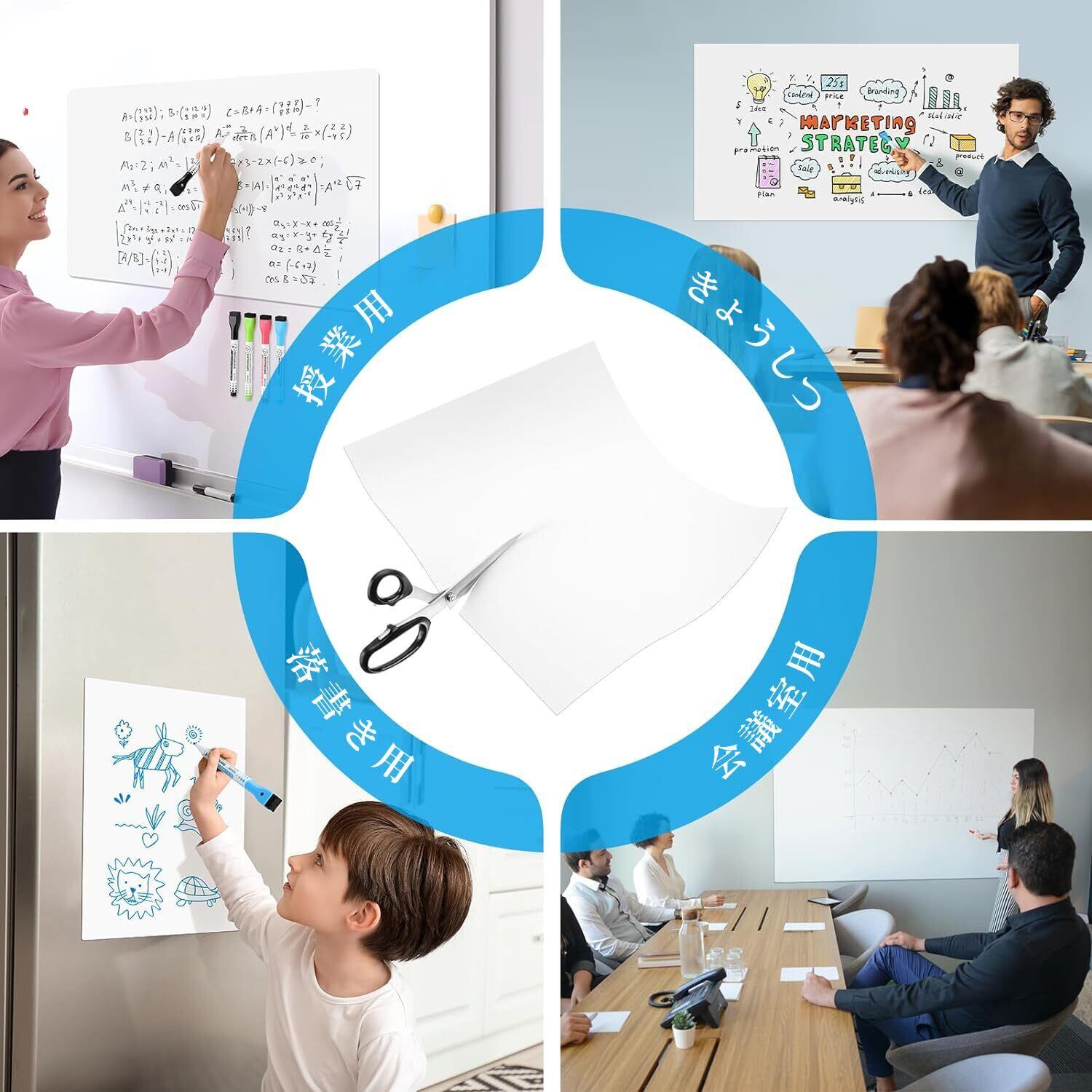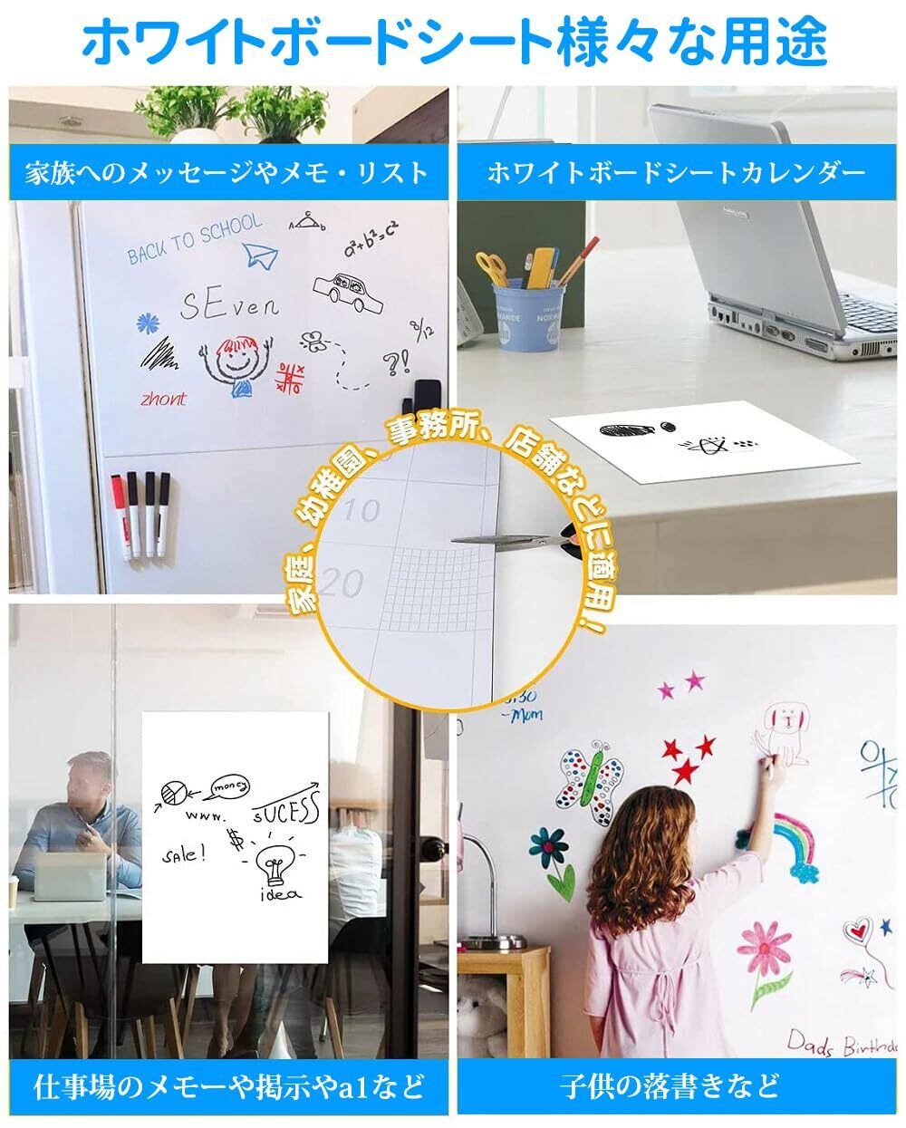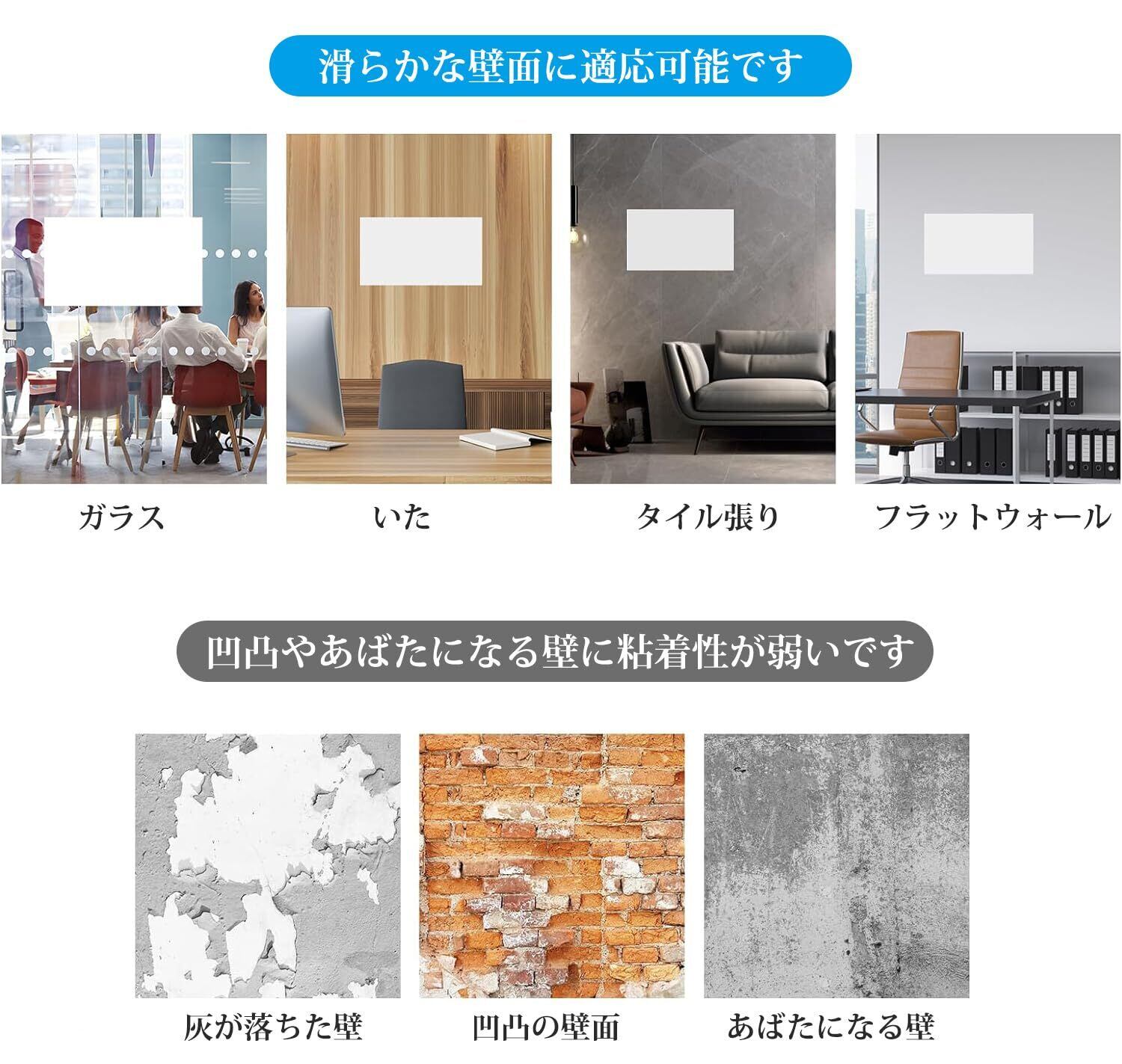 【インストールが簡単】ホワイトボード シート裏面に粘着剤が付いており、貼付剤が必要なく、貼付が簡単で、糊残りが無く。平らな壁、ガラス、キッチン、金属表面に直接貼り付けることができ、使いやすく、ただし接着部分の粘性が強いので、設置前に位置をよく確認して正しい場所に貼り付け、押さえながらゆっくり貼り付けてください。女性の方やお年寄りでもお気軽に使えます。* 使用する前に透明フィルムをはがしてください。