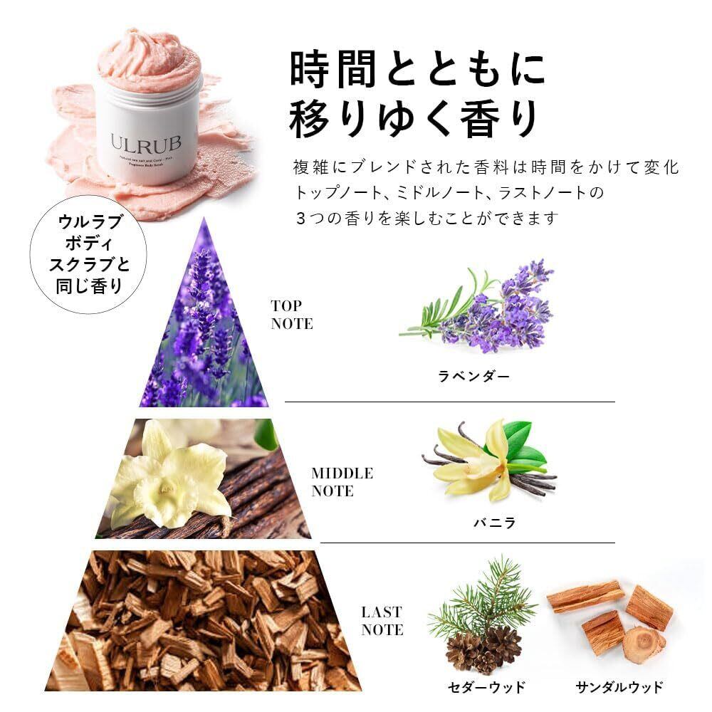 ULRUBシリーズ同様アロマの香りのフレグランス仕様でエプソムソルトの効果によりぽかぽかな温泉気分を味わえます。また沖縄の2種類のサンゴが肌を清潔に保ち整えます