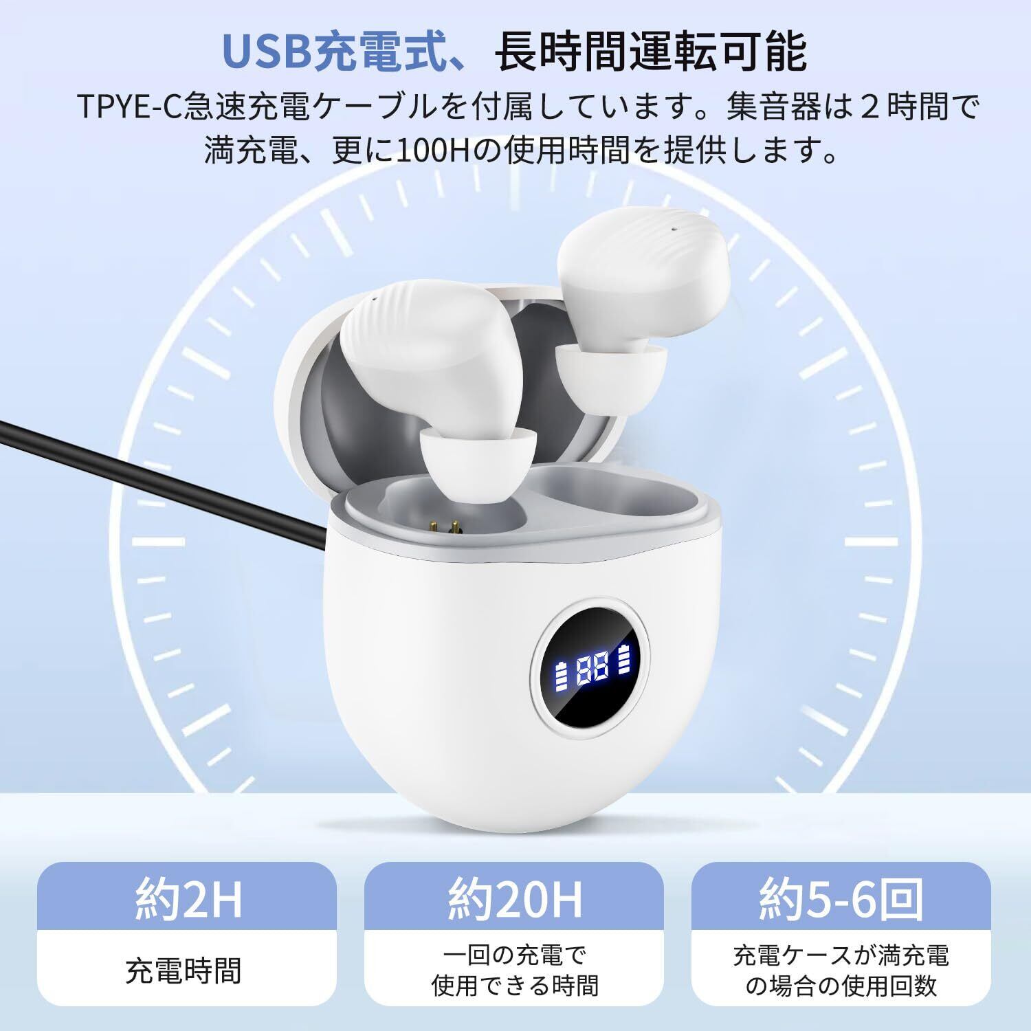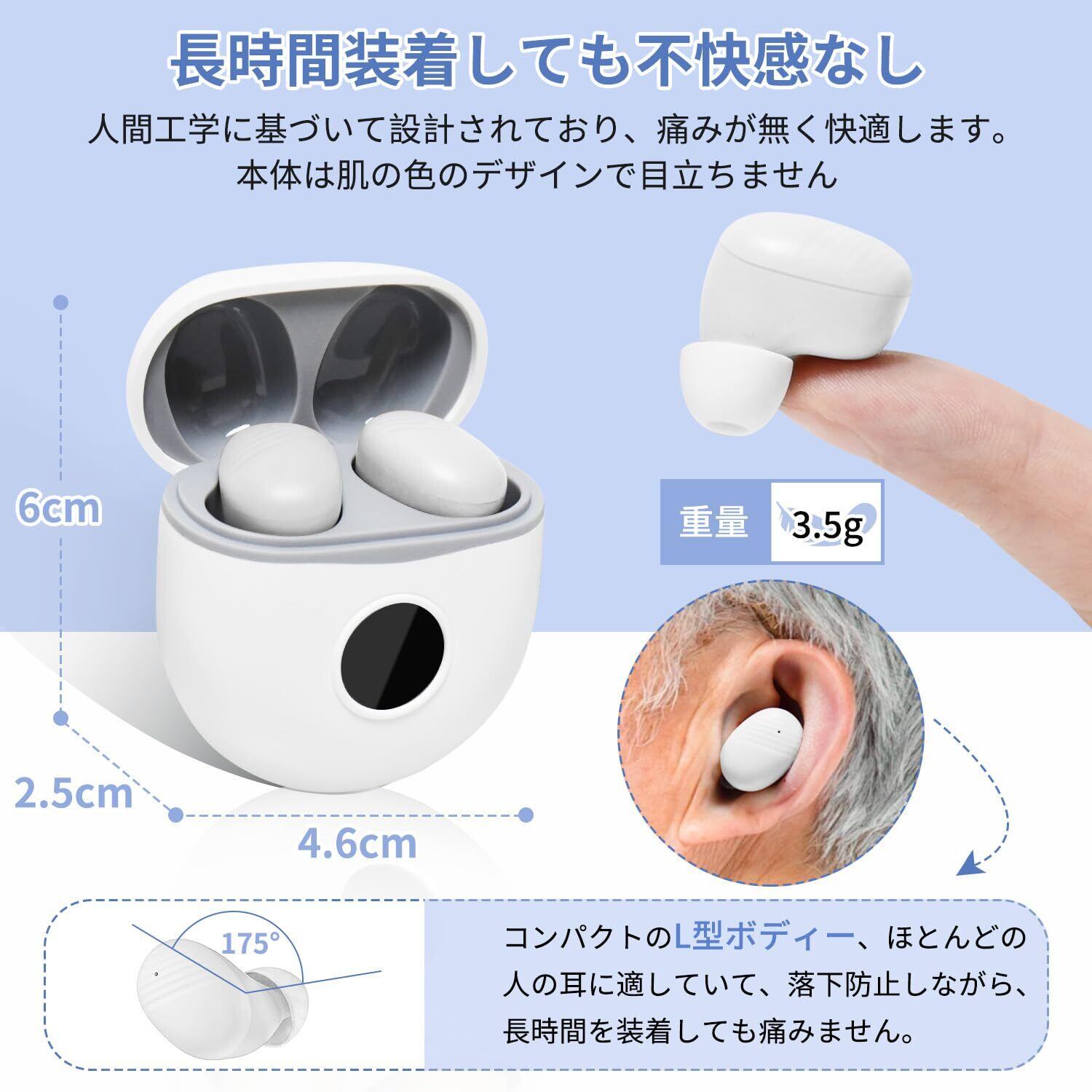 【人間工学設計、快適な装着感】人間工学に基づいたデザインはファッショナブルで目に見えないため、使用者に心理的な圧力を与えません。集音器本体はコンパクトのL字型で、弧は175°、耳への負担を大幅に軽減し、長時間に装着しても痛みません。初めてご使用の前に、集音器の絶縁保護フィルムをはがし、充電ケースに入れて2〜3時間充電してください。