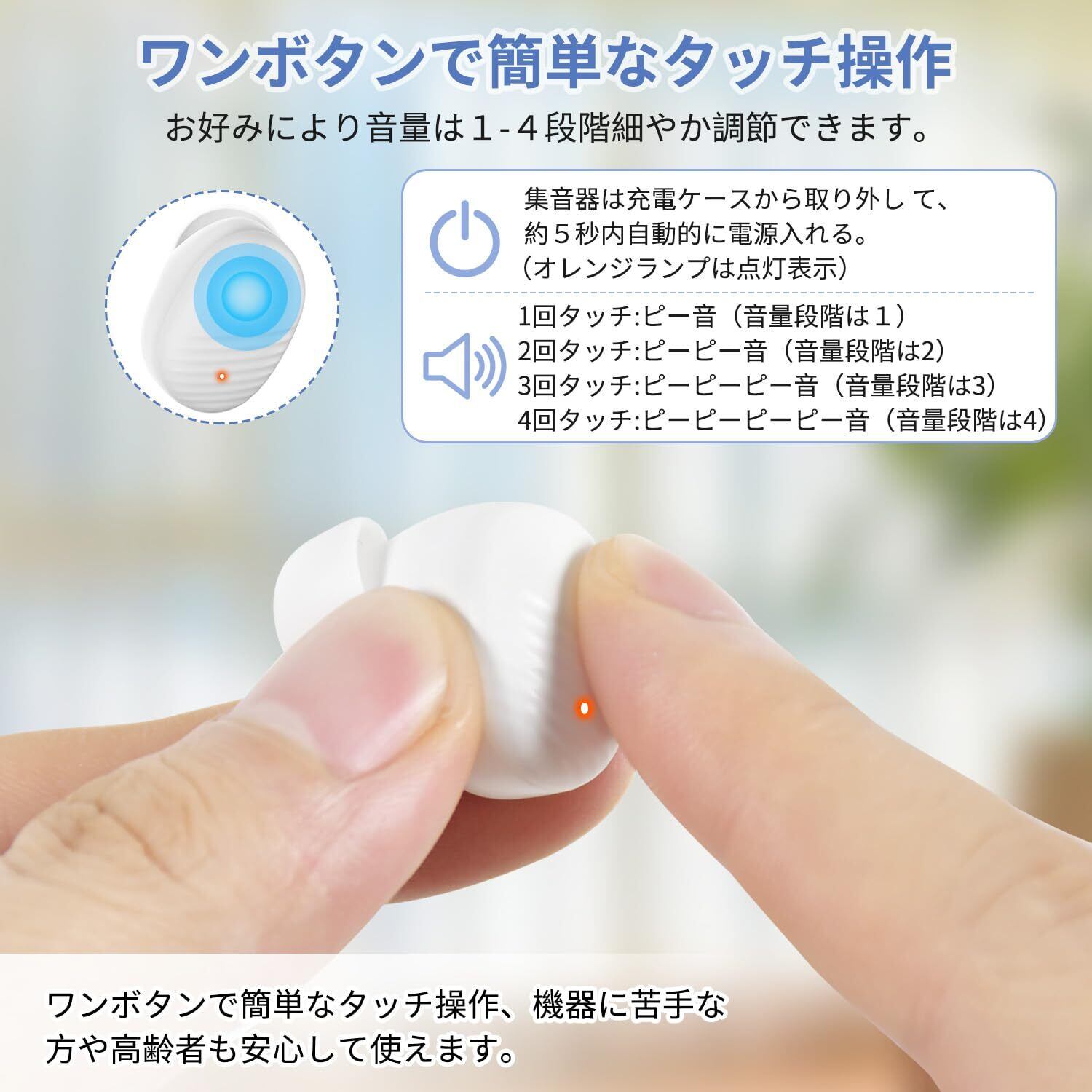 【ワンボタン・タッチ式簡単操作】Munydayの集音器は充電ケースから取り出して本体の指示ランプはオレンジ点灯を表示し、5秒内に自動的に電源入れ、それから耳に置くだけ操作は完了。操作は簡単で、お年寄りや若い方に問題なく使用します。