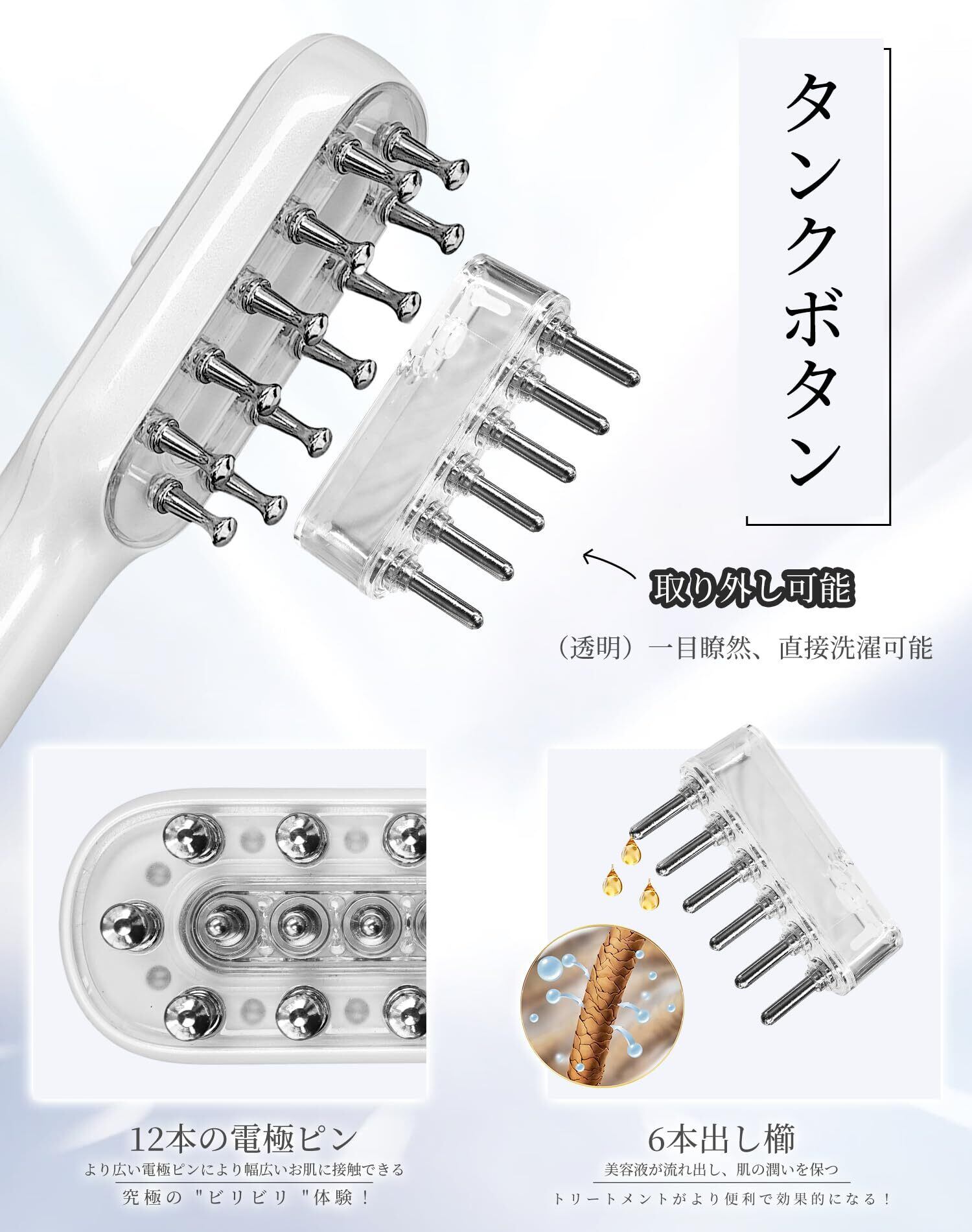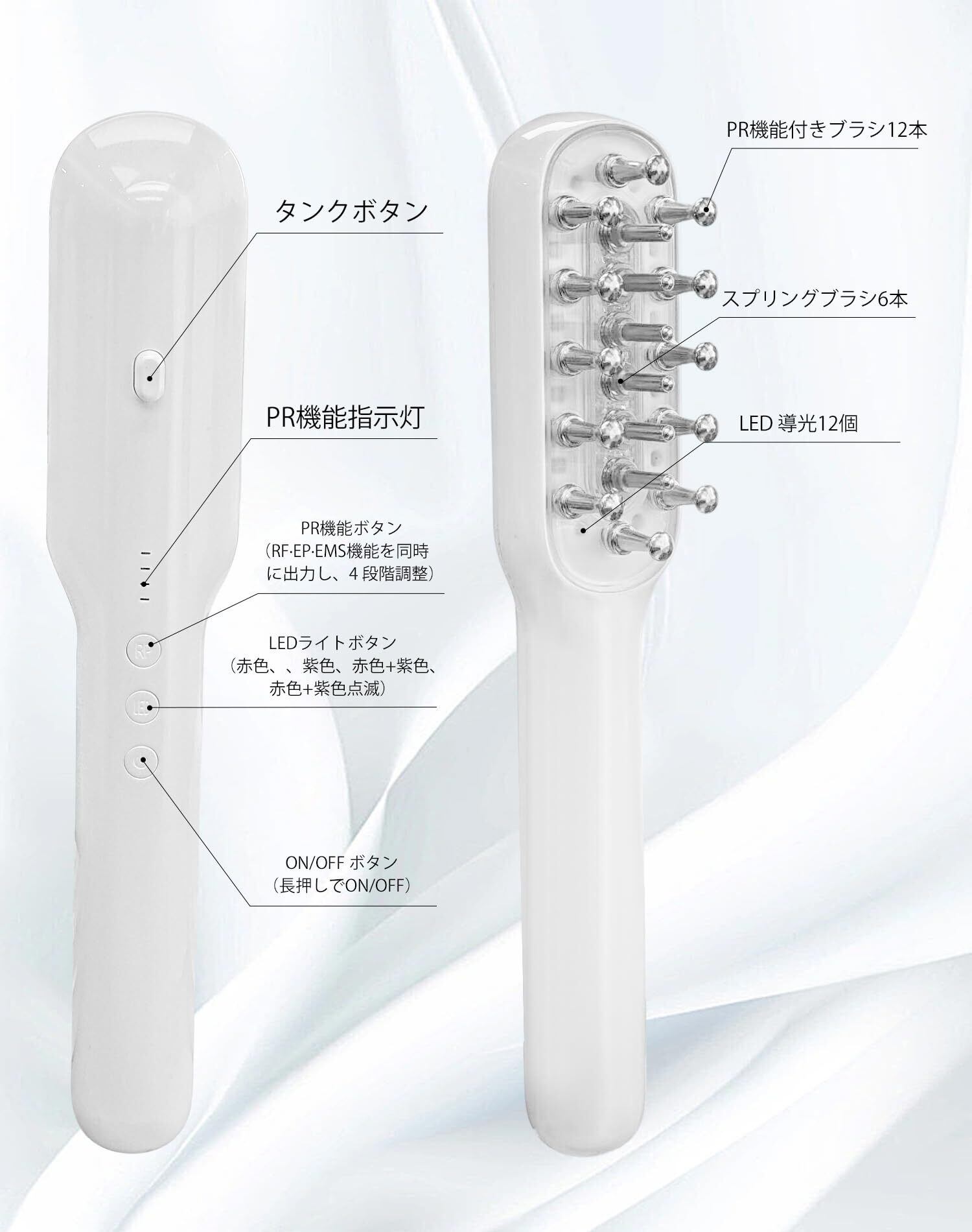 【4種類の機能】電気ブラシには、12本の電極歯を搭載しています。電源を入れると、ブラシのEMS、RF、EP、LEDの各機能が同時に作動します。 微電流+温熱+浸透が連動し、より効率的に肌をトリートメントします。さらに、赤色LEDと紫色LEDの2種類の光波を搭載。お肌の状態により相応しいLEDモードをお選びいただけ、気になる肌の悩みを解決します。※初めて使用する際にはレベル1から使用することをおすすめします。必要に応じてレベルを調整してください。※EMSの強さは、肌の耐性によって異なる。お肌は敏感な場合、ただちに利用中止してください。