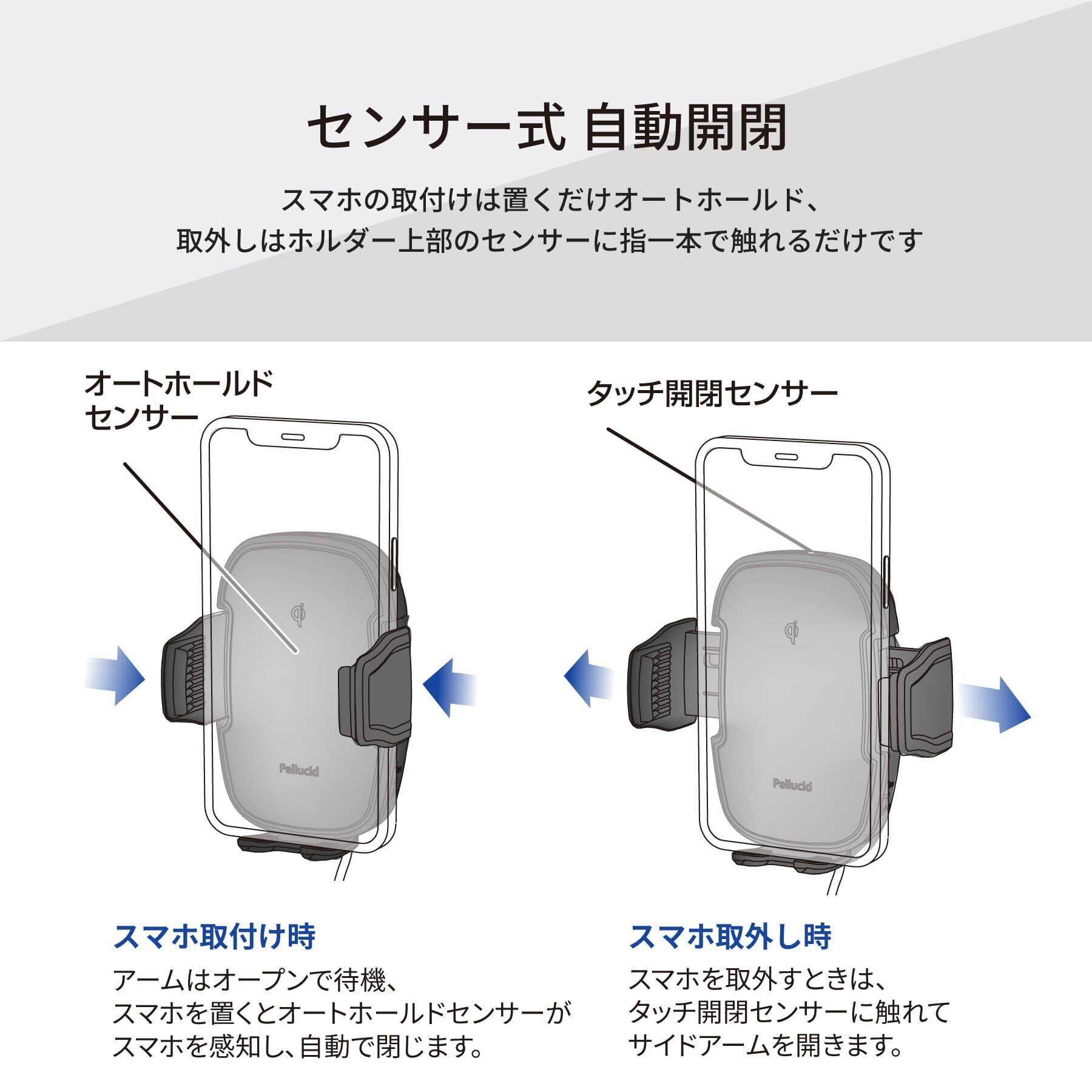 スマホ取付時、スマホを置くとオートホールドセンサーがスマホを感知し自動で閉じます。スマホ取り外し時、タッチ開閉センサーに触れるとサイドアームが開きます。センサーに触れる事によりアームがオープンするので誤作動でアームが開き大切なスマホが落下する心配がないので安心です。