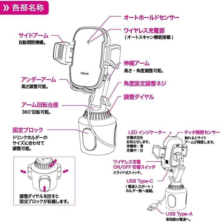 高速ワイヤレス充電+自動開閉+キャパシタ+オートスキャン機能搭載 ペルシード車載スマホホルダー ドリンクホルダー取付タイプ PPH2305