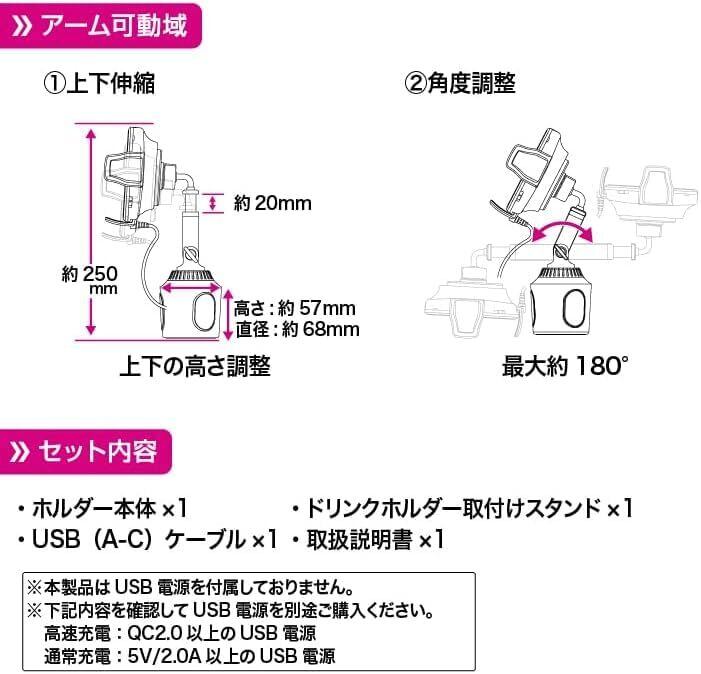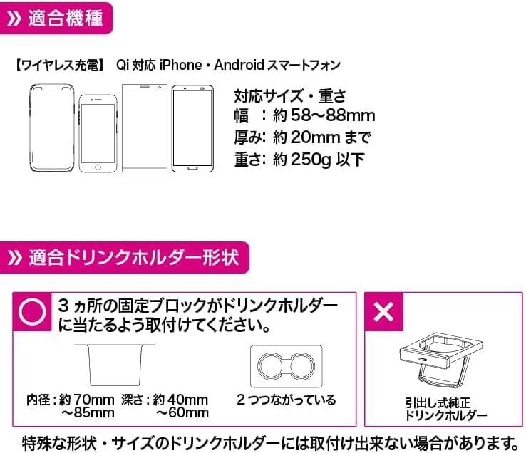 スマホの縦&横置き対応。お好みの位置に合わせて上下伸縮も可能。ドリンクホルダー取付スタンドは設置後も360°回転。人気車種 アルファード/ノア/ヴォクシー/n-box などにおすすめ 手帳型ケース レザーケース シリコーンケースをご使用の場合でもワイヤレス充電は可能ですがケースの厚みや形状により充電ができない場合がございます