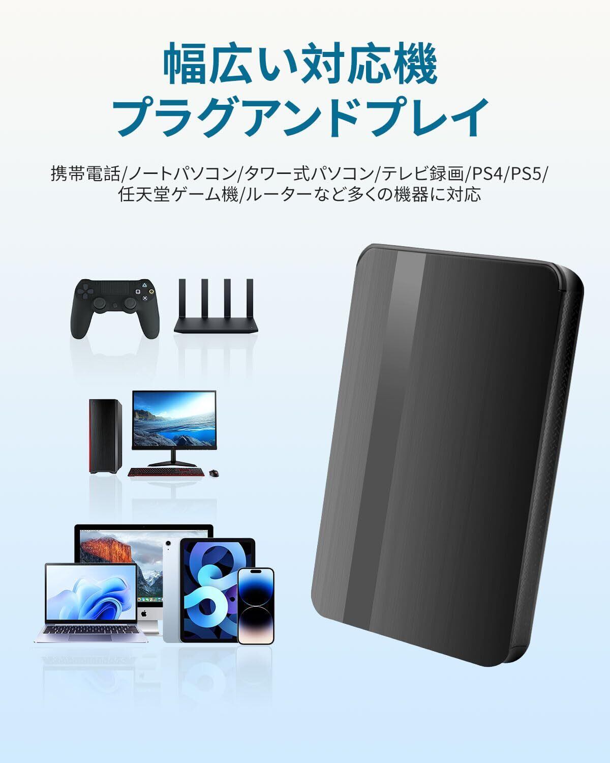 【大容量外付けHDD】大容量ハードディスク - データを簡単に外付けHDDで保管 このハードディスク外付けは、写真、動画、音楽、ゲームなどの大容量データをまとめて保管可能。日常のデータバックアップや、オフィスでの重要なファイル保存に最適な外付けHDDです。ポータブルで安全な設計。故障予測機能でデータを保護し、LEDインジケーターでユニットの動作状態を簡単に確認できます