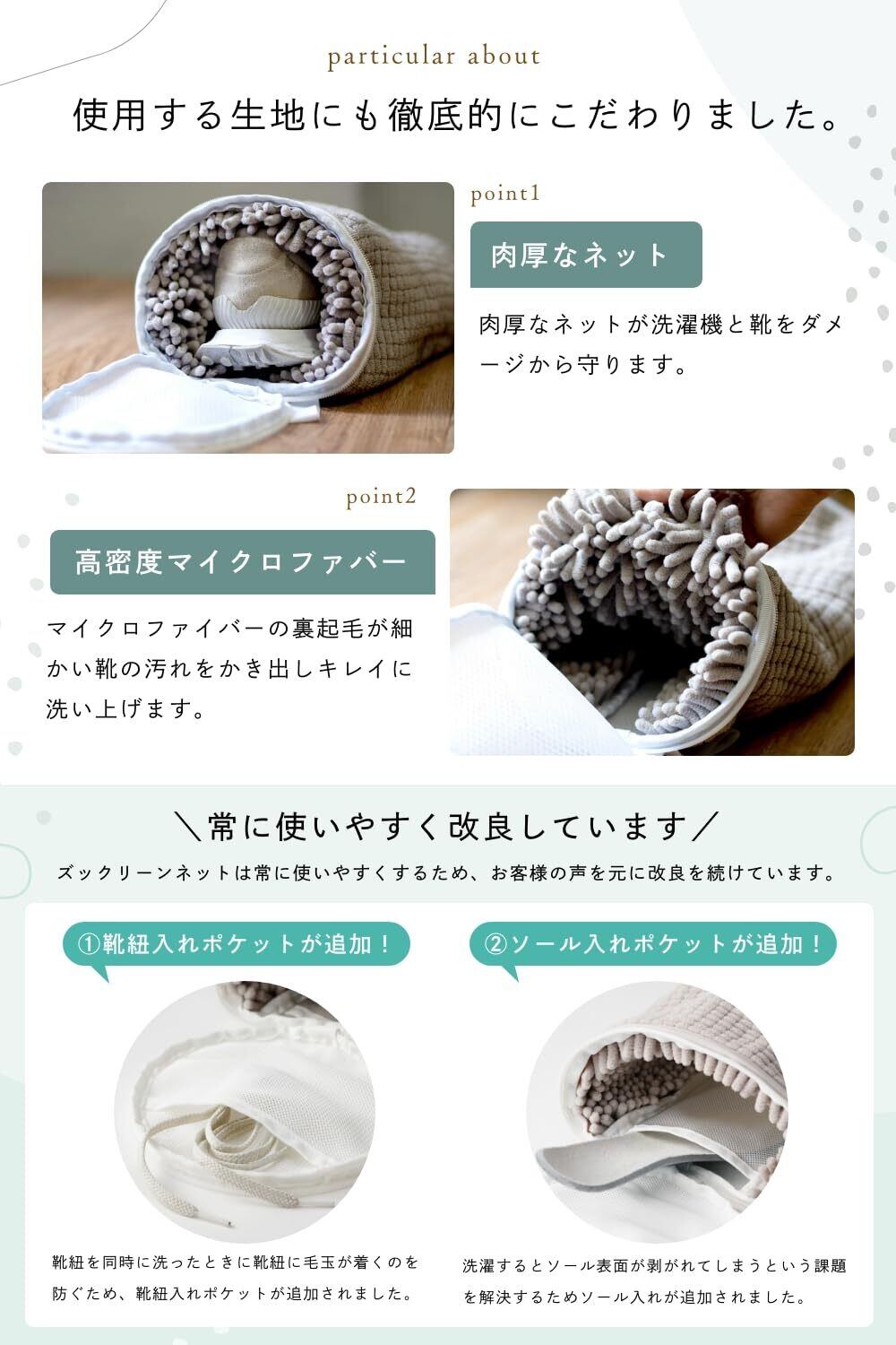 肉厚なネットは洗濯機と靴をダメージから守りつつ、マイクロファイバーの裏起毛が細かい靴の汚れを掻き出し綺麗に洗い上げます。