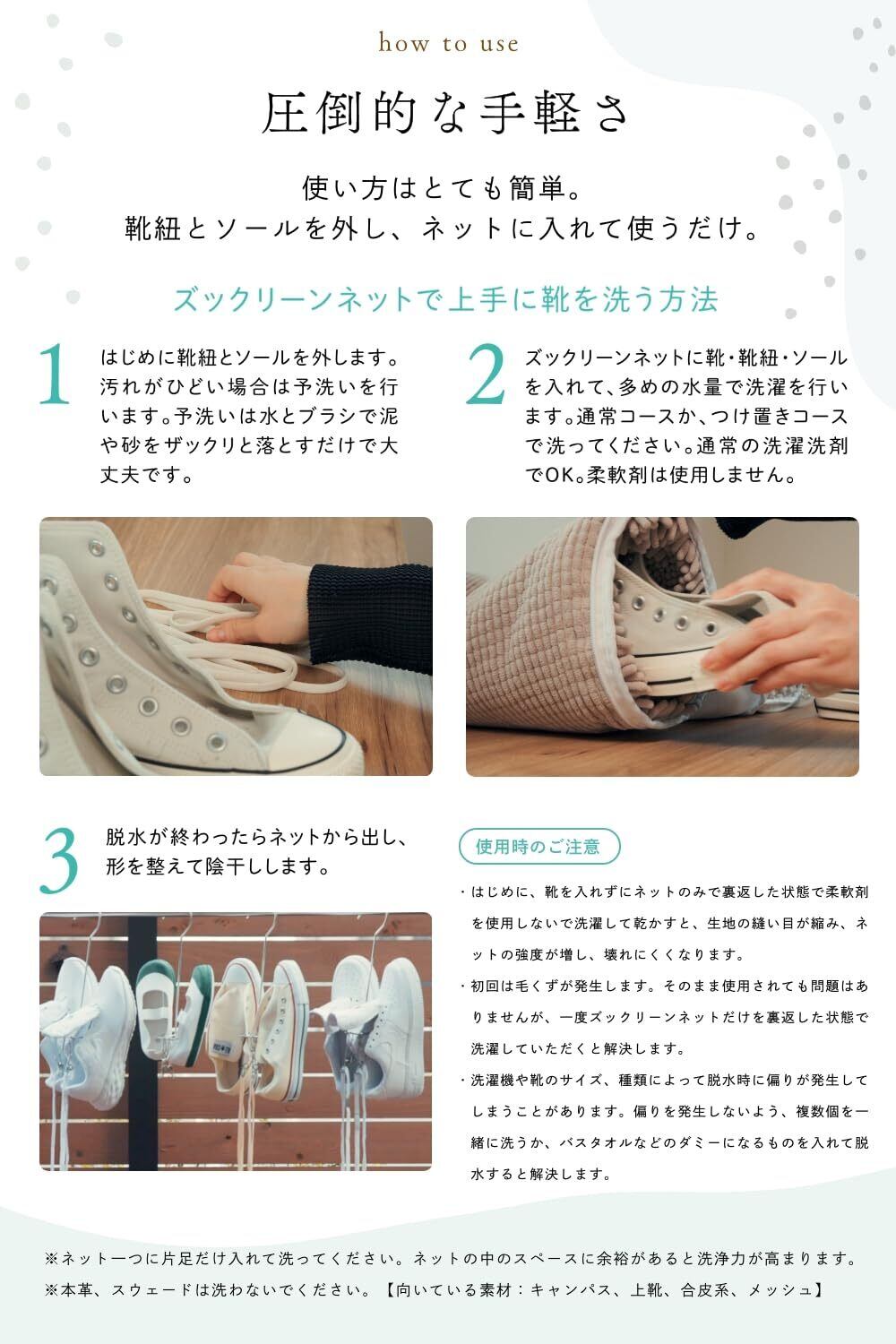 ネット一つに靴を一つ入れて2つセットでお洗濯してください。複数の靴を一つのネットに入れると靴が中でぶつかり合ってしまいボロボロになってしまいます。2個セットで販売するのには理由があります。