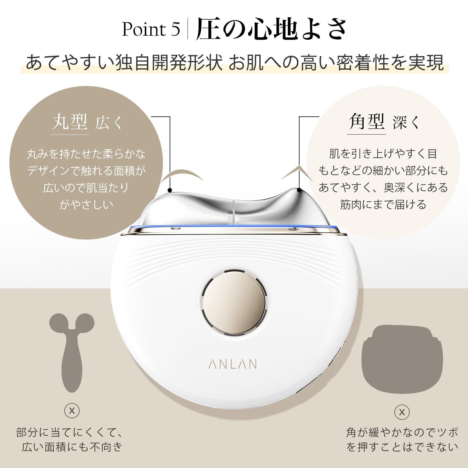 独自開発の形状でお肌への高い密着性を実現。カッサプレートの角型部分は細かい部分にあてやすく、ピンポイントで深く刺激できます。丸型部分は広い面積に触れるため、肌に優しく、短時間で効率的にケアが可能です。