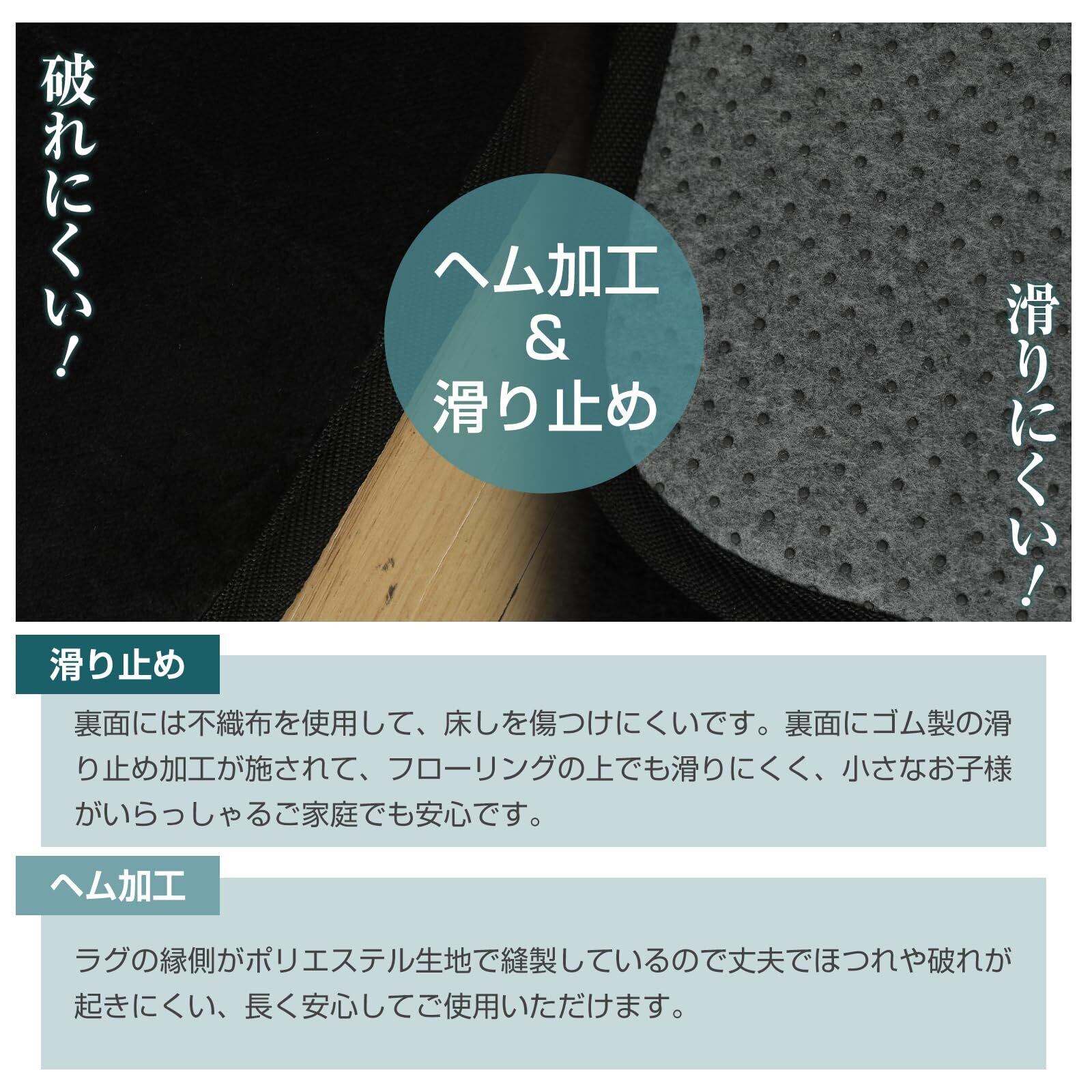 【滑り止め・耐熱加工】ラグマットの裏面には滑り止め加工が施されており、床を傷つけず安定して使用できます。さらに耐熱加工もされているので、暖房器具の近くでも安心です。