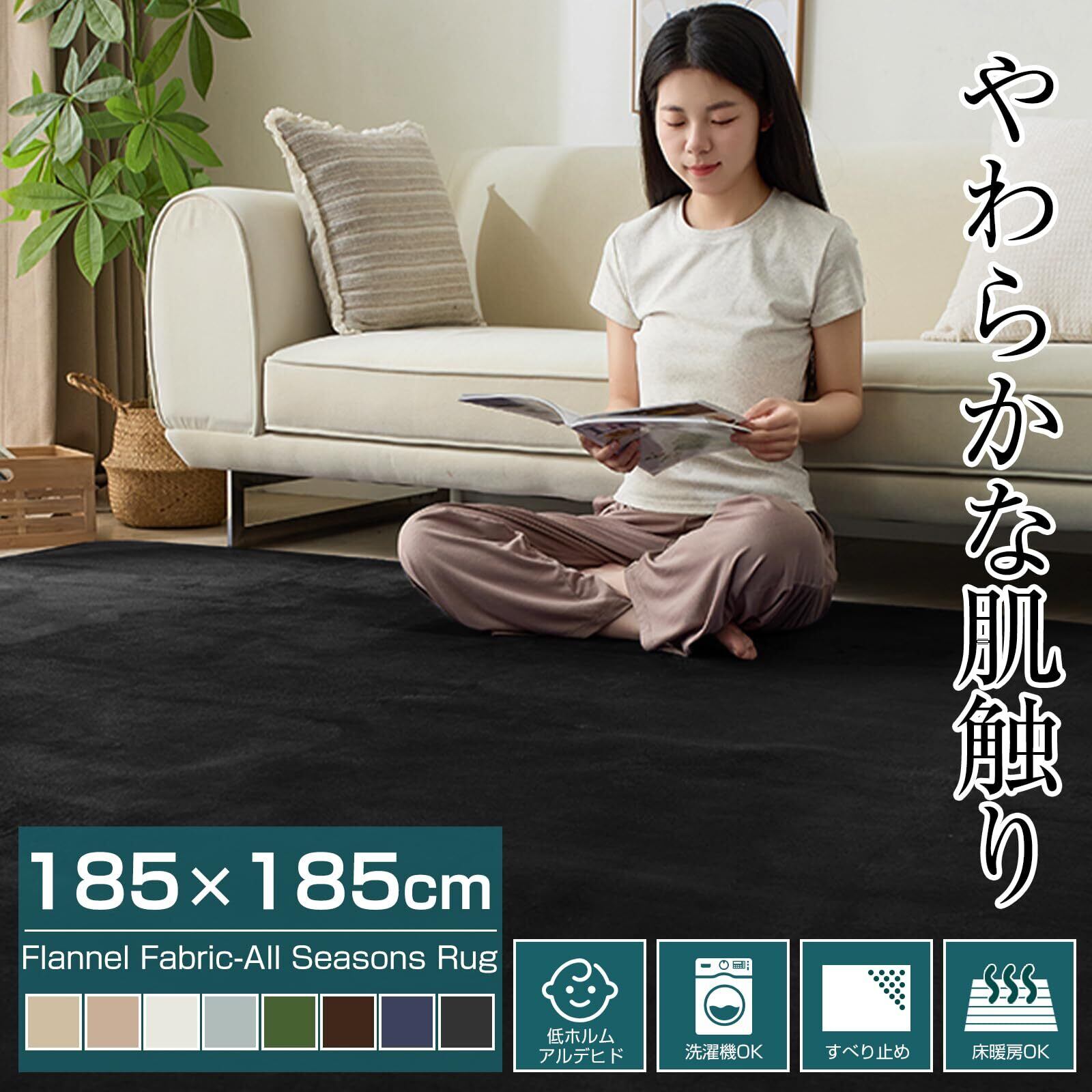 Housecover カーペット ラグ ラグマット滑り止め付 洗える 185×185cm 約2畳 絨毯 防ダニ 抗菌 防臭 オールシーズン快適に使用 床暖房 ホットカーペット対応 ふわふわ肌触り フランネルラグ ブラック