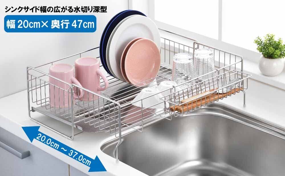 ヨシカワ 水切りラック 水切りかご 日本製 箸置き付き 幅20×奥行47cm 4~5人用 シンクサイド 幅の広がる 深型 1305933 食器 水切り カゴ 台所 シンク トレー キッチン バスケット