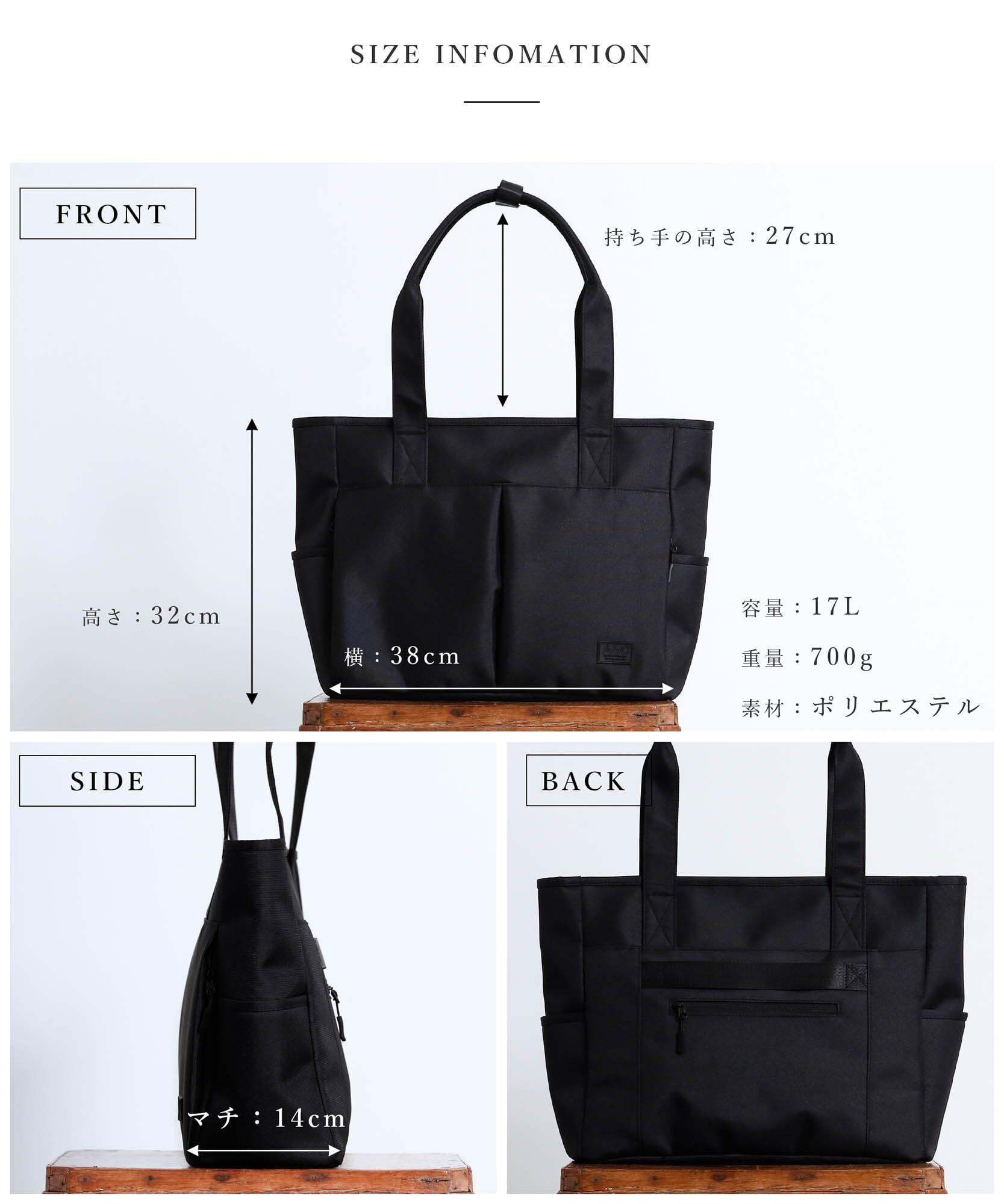 シンプル! 大容量!バツグンの使いやすさのトートバッグが登場です。ベーシックデザインのシンプルなトートバッグです。余分な装飾を省いた、ユーティリティー重視の使えるバッグ!ハンドルの長さは25cmで肩掛けしやすいサイズ感。本体入り口はZIP開閉式なので安心です。両サイドにはペットボトルや折りたたみ傘入れにも使えるサブポケット付き。表面・裏面ともに、外面はA4サイズが入るポケット仕様となっております。内側にはオープンポケット・ZIPつきポケットと、マジックテープ式のメッシュポケットで小さなものも小分けして収納できます。普段づかいはもちろん、通勤・通学にもぴったり。カジュアルにもビジネスにも使える定番アイテムです!
